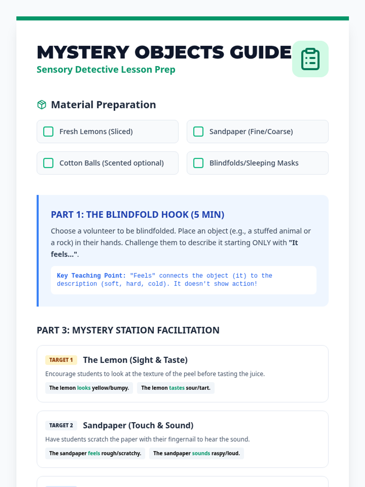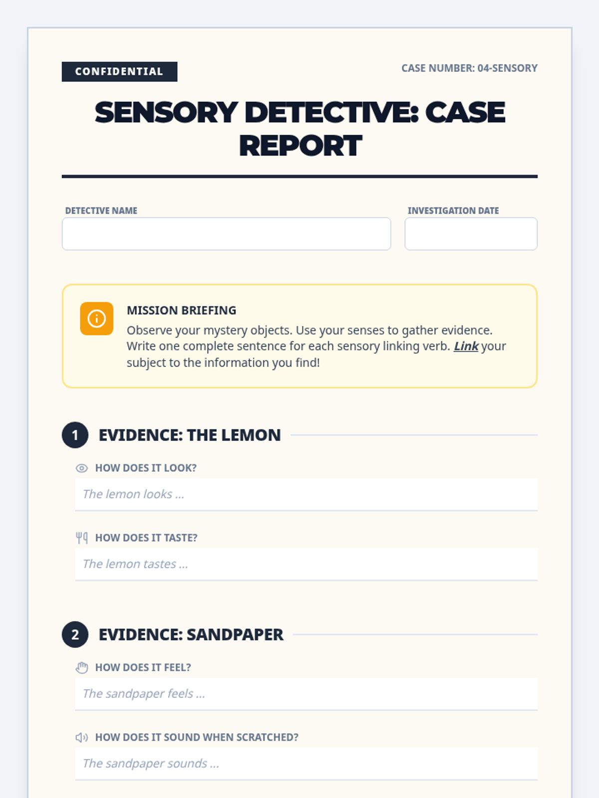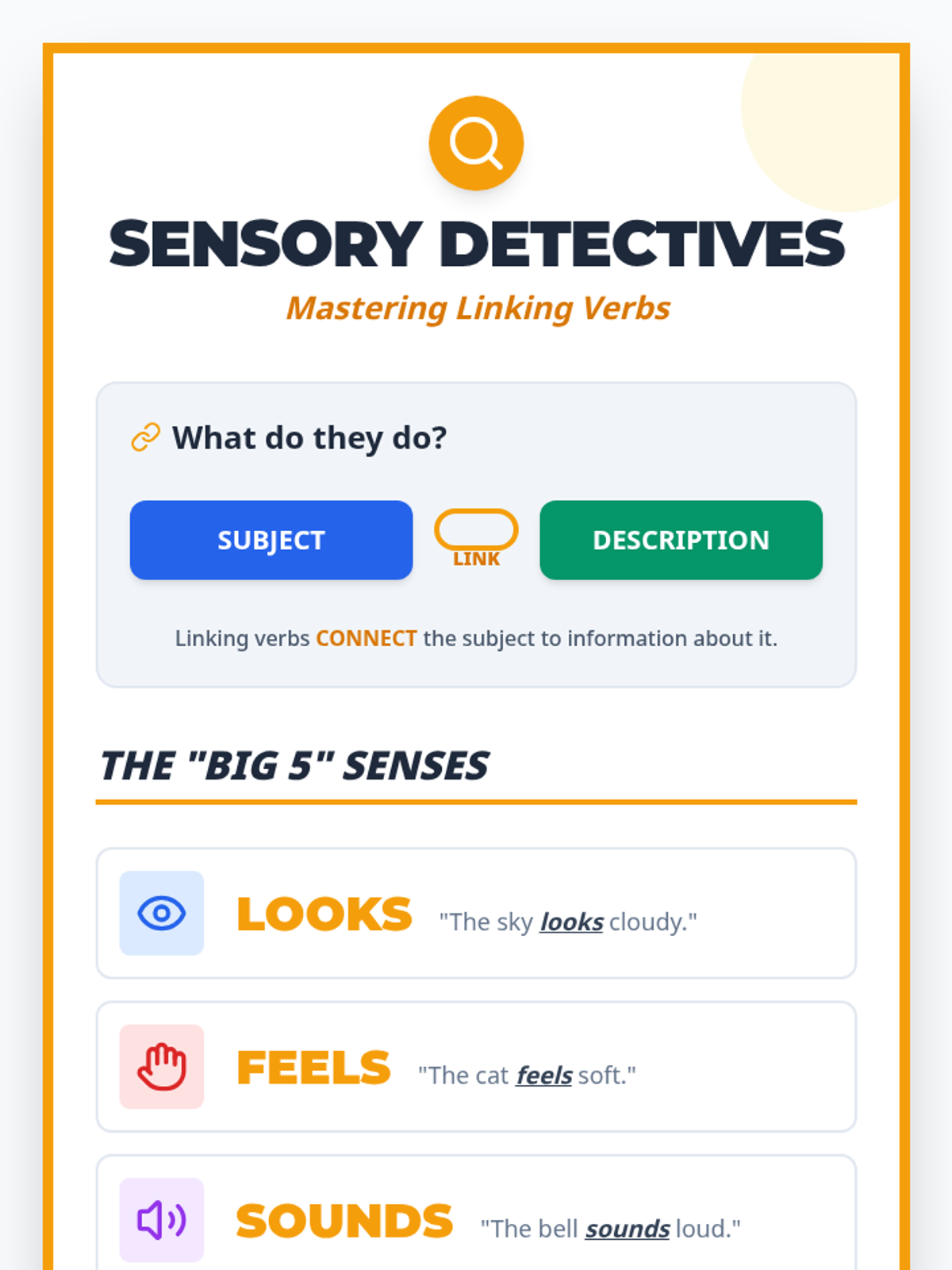 Students will transform into 'Sensory Detectives' to explore how linking verbs connect subjects to descriptive sensory details. This lesson uses a blindfold hook, a targeted video segment, and hands-on investigation of mystery objects to master the use of looks, sounds, feels, smells, and tastes.