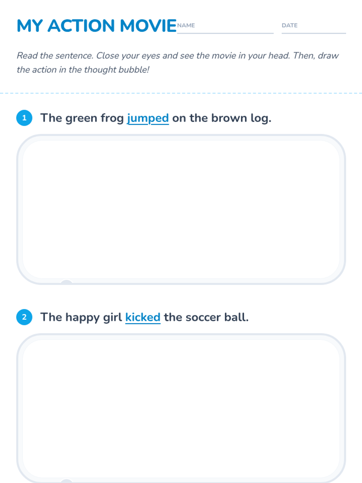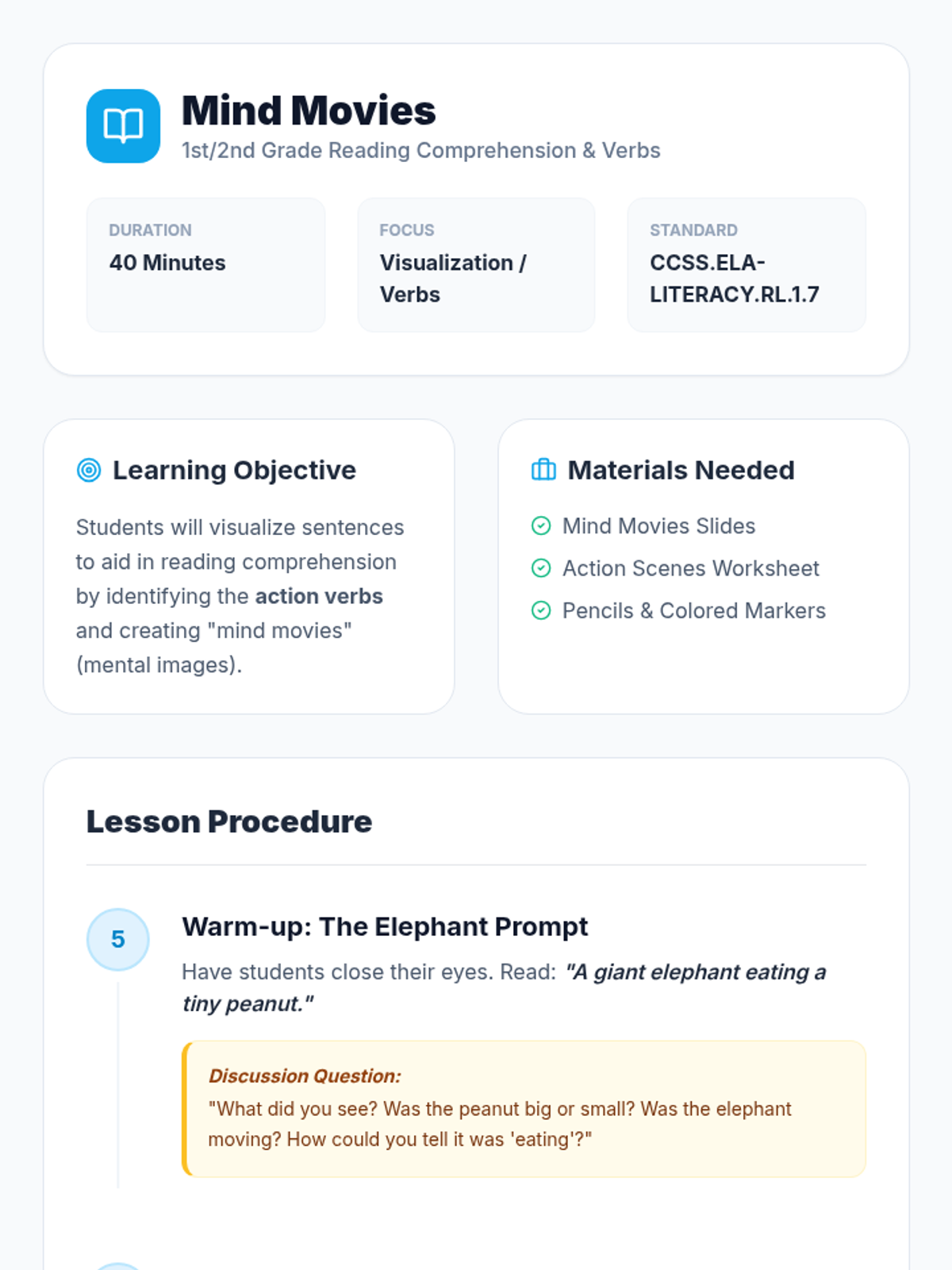 A 1st/2nd grade lesson focused on using visualization (making 'movies in the head') to understand action verbs and improve reading comprehension. Students watch a guided video and practice drawing scenes based on descriptive sentences.