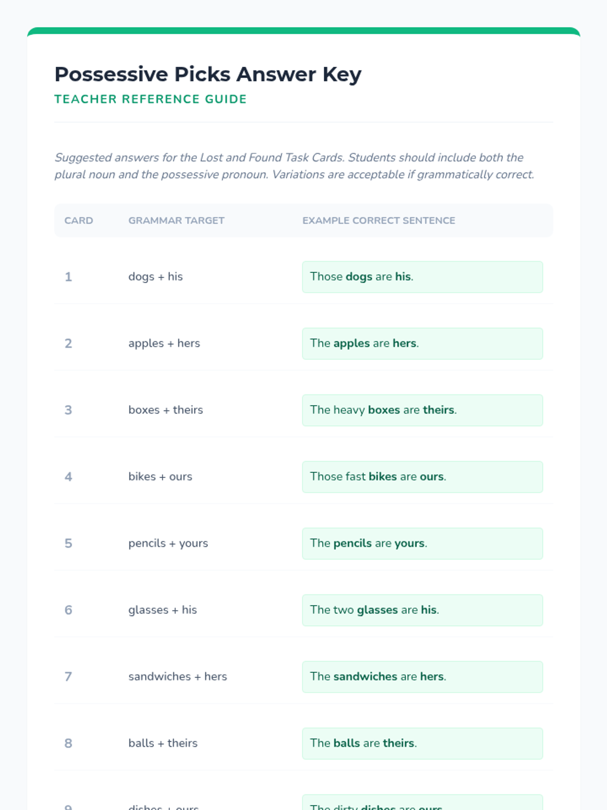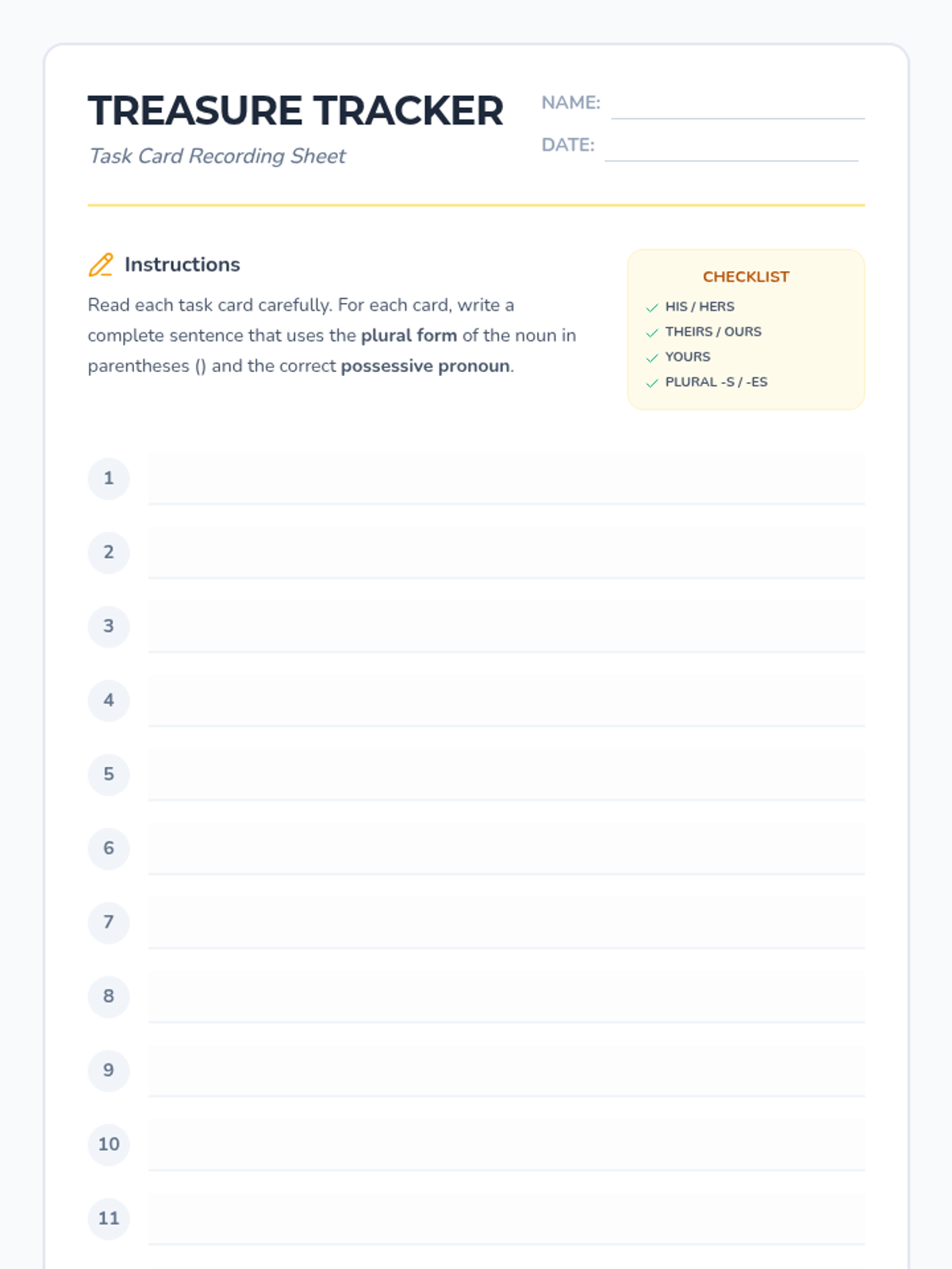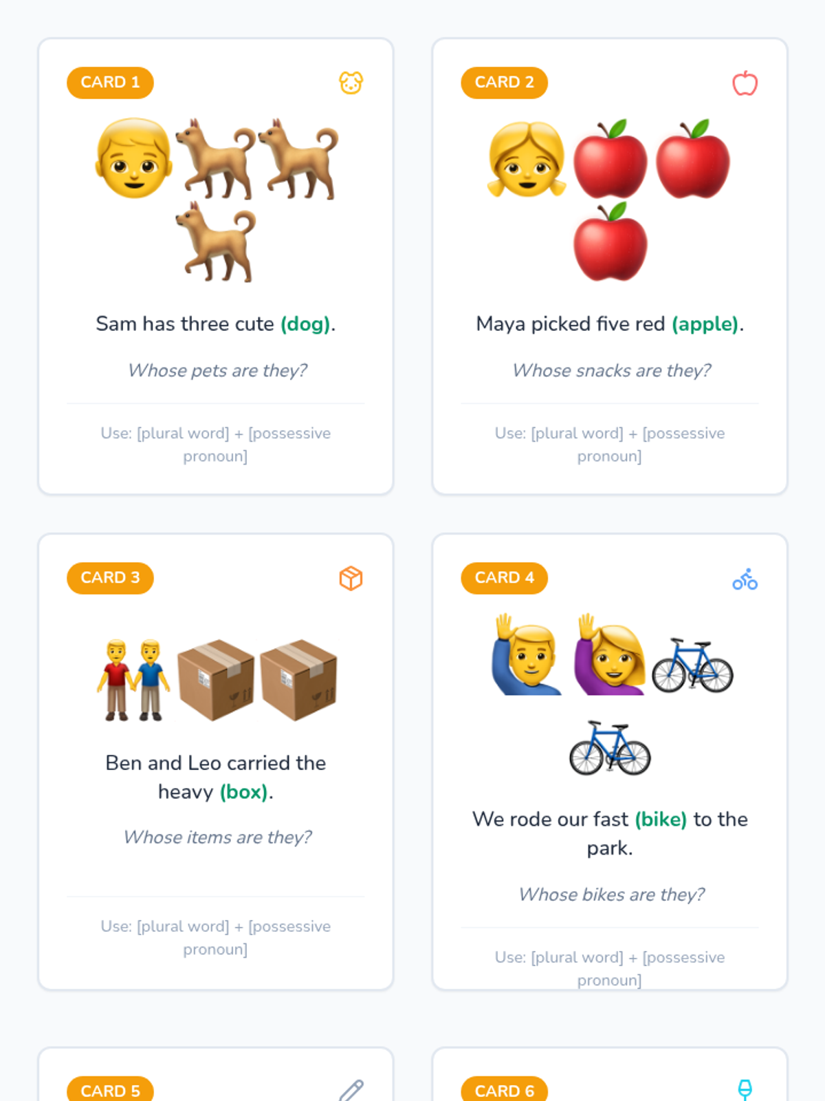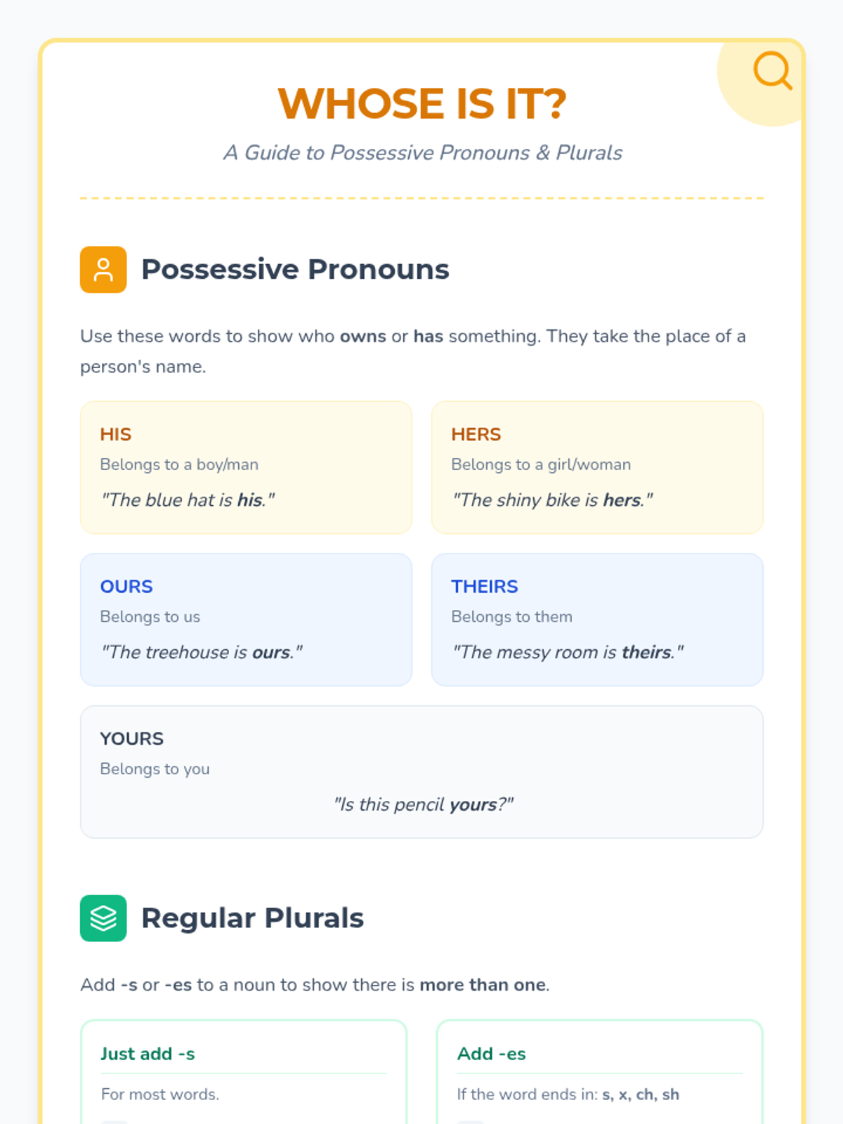 A comprehensive lesson focused on mastering possessive pronouns (his, hers, ours, theirs, yours) and regular plurals (-s, -es) through visual prompts and structured practice.