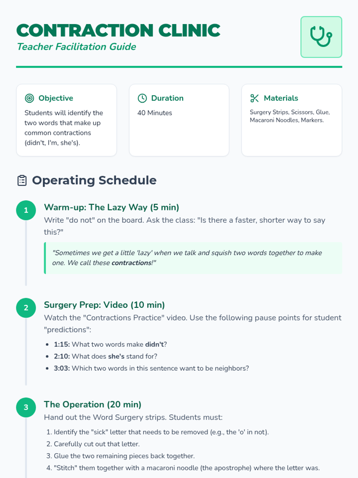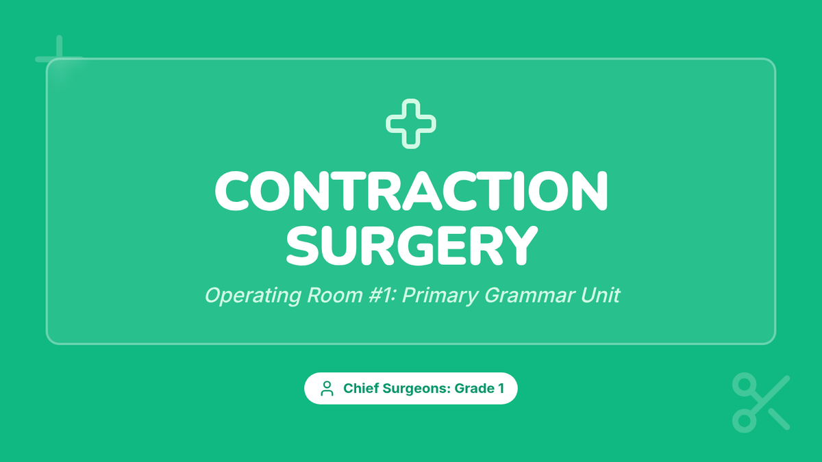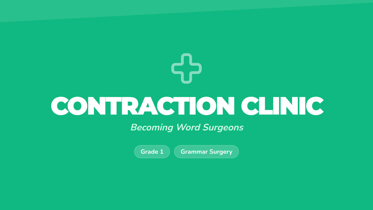 A medical-themed lesson for 1st graders to learn about contractions through 'Contraction Surgery' and an engaging instructional video.