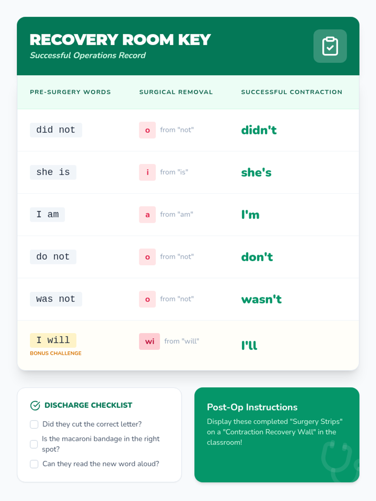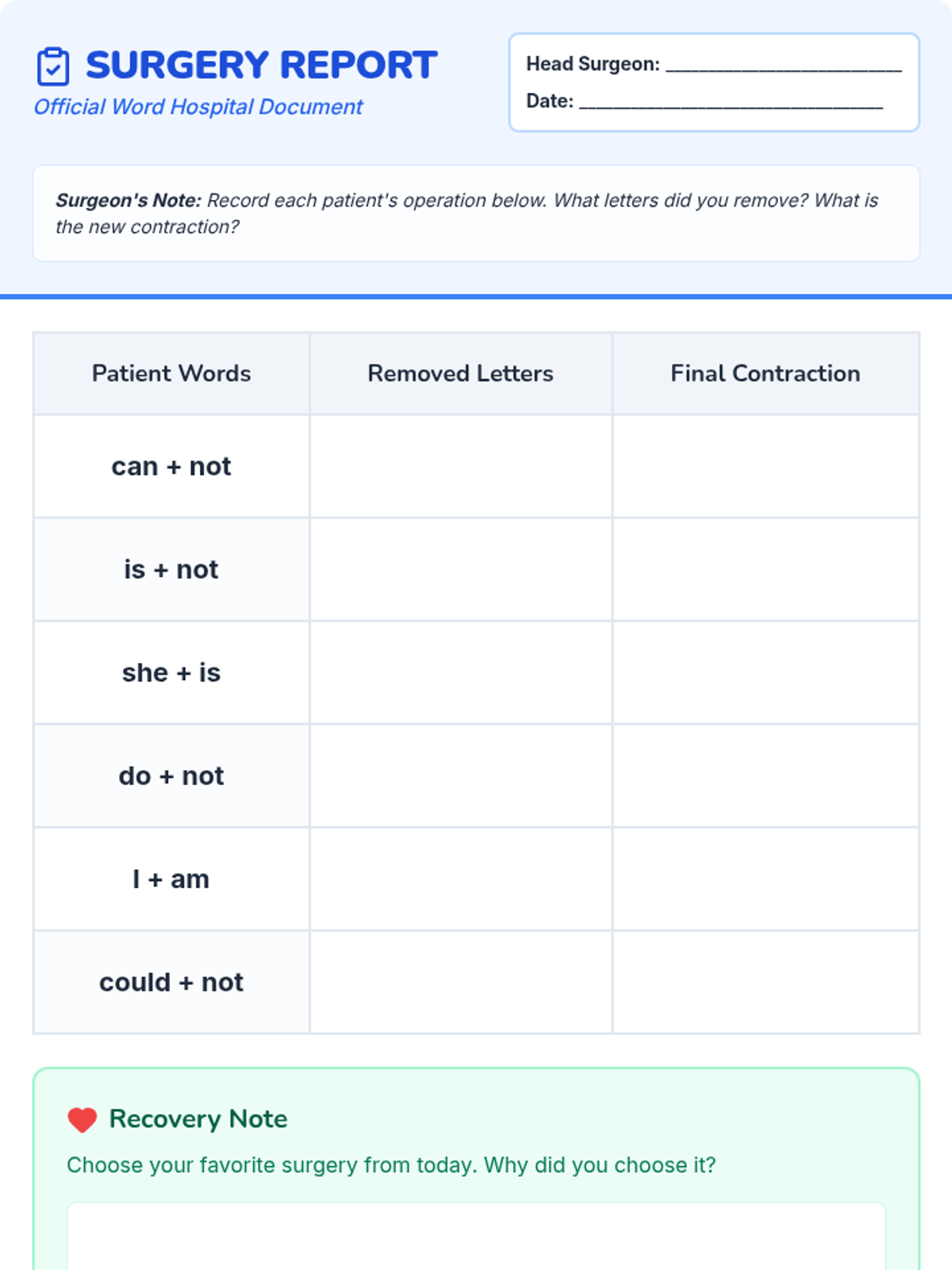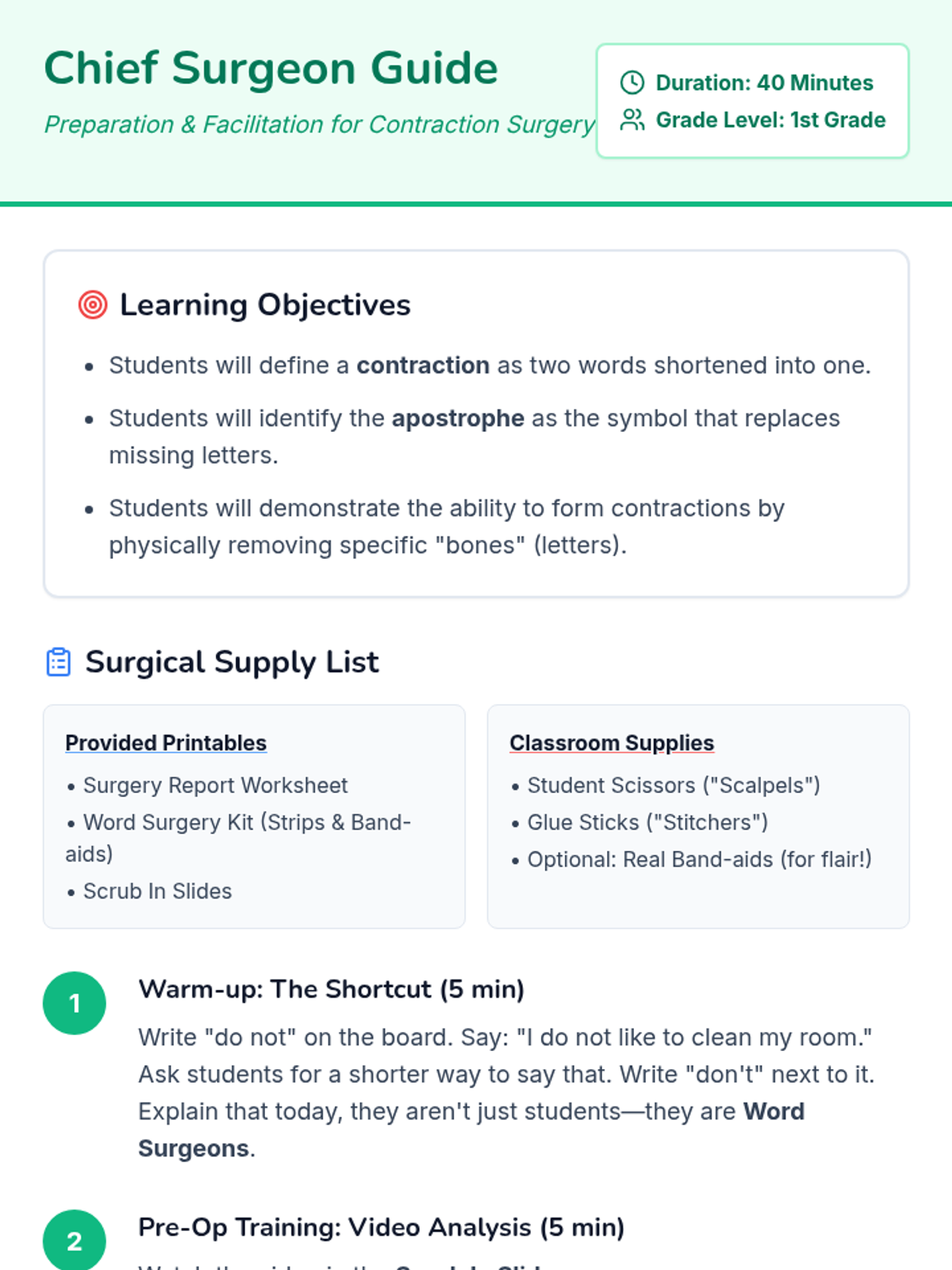 A medical-themed lesson for 1st graders to learn about contractions through 'Contraction Surgery' and an engaging instructional video.