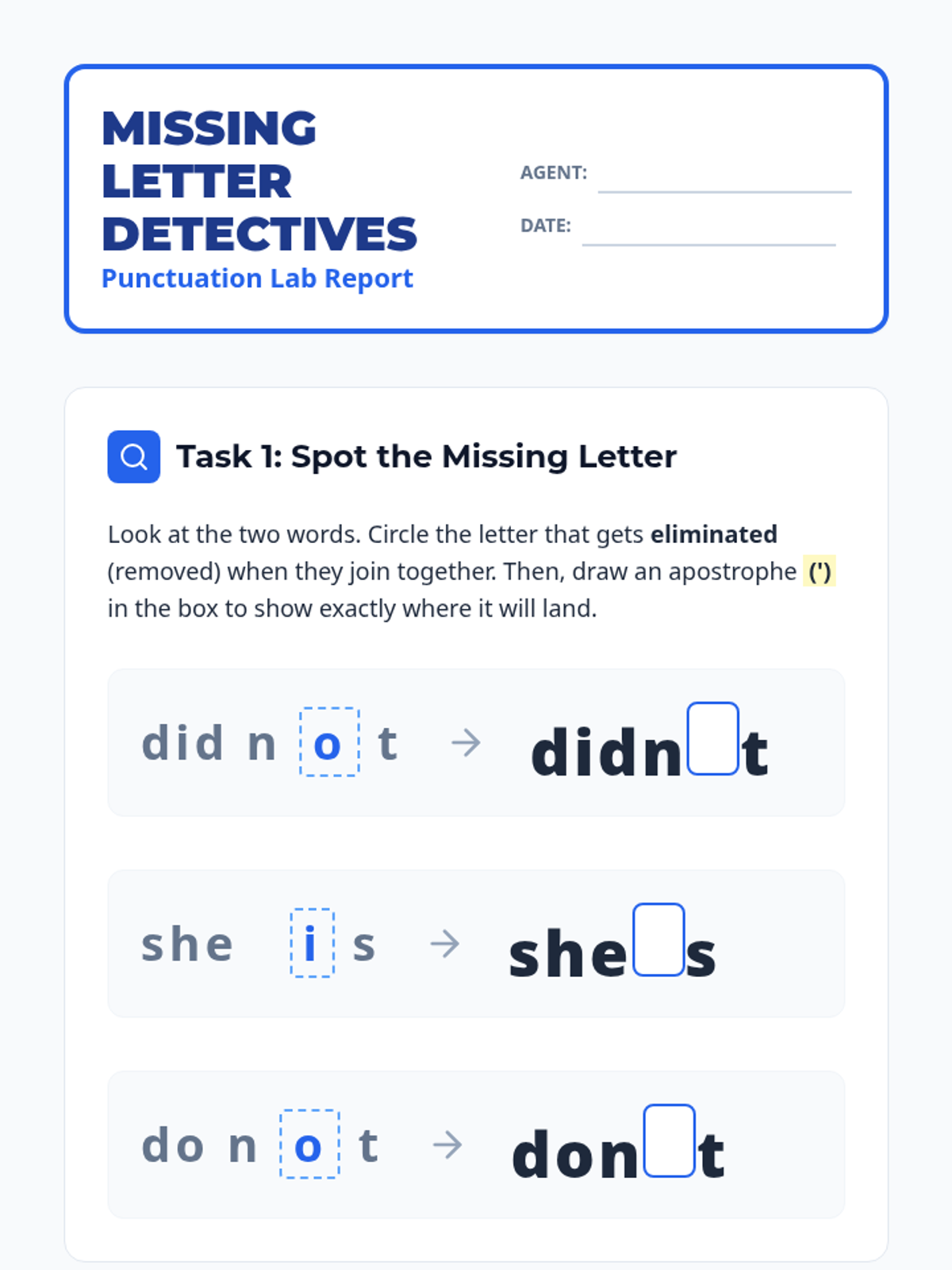 Students learn to use the apostrophe as a 'glue' tool to combine words. They will transform stiff sentences into smooth ones by replacing word pairs with contractions.