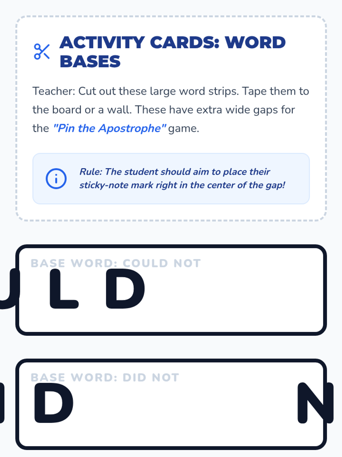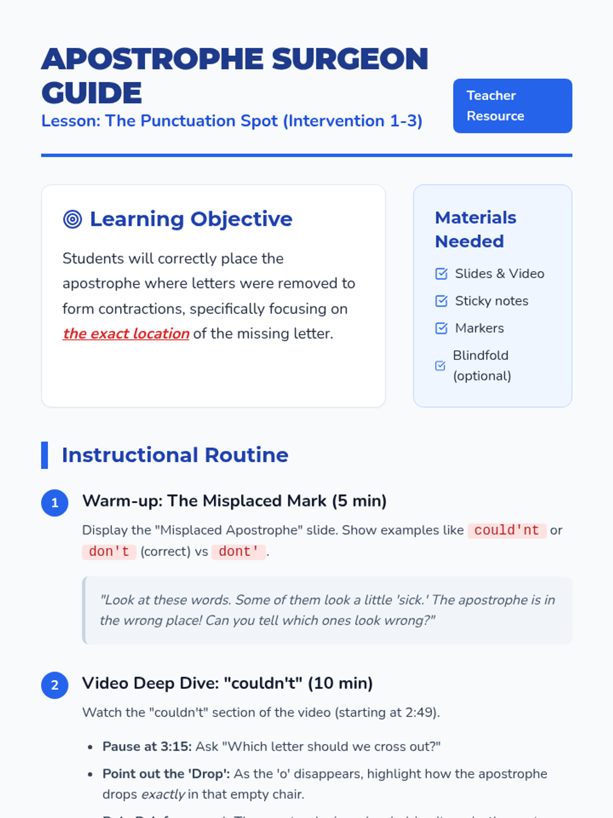 A focused intervention lesson for 1st-3rd graders on correctly placing apostrophes in contractions by identifying where letters were removed. Includes a hands-on 'Pin the Apostrophe' activity and video analysis.