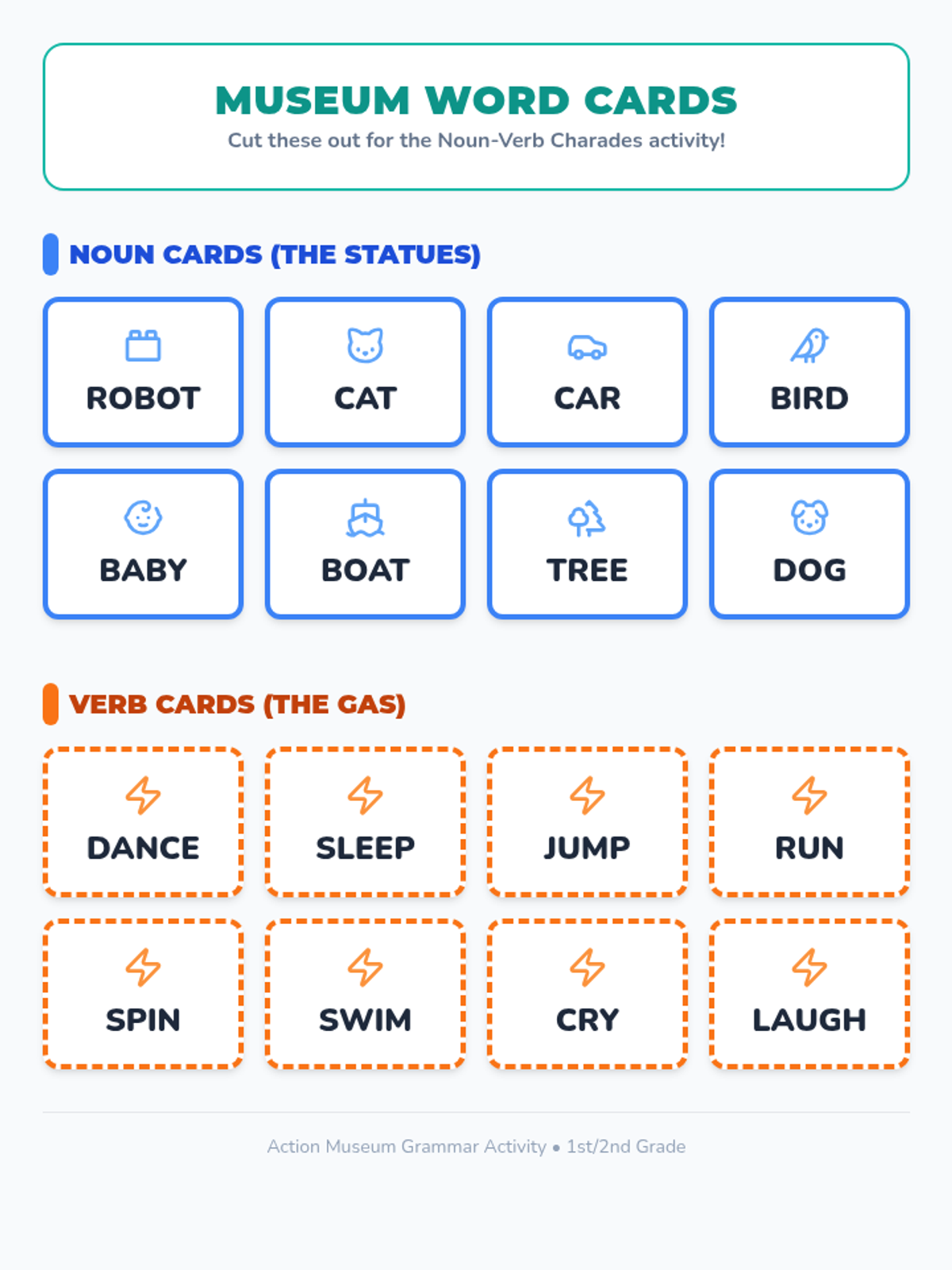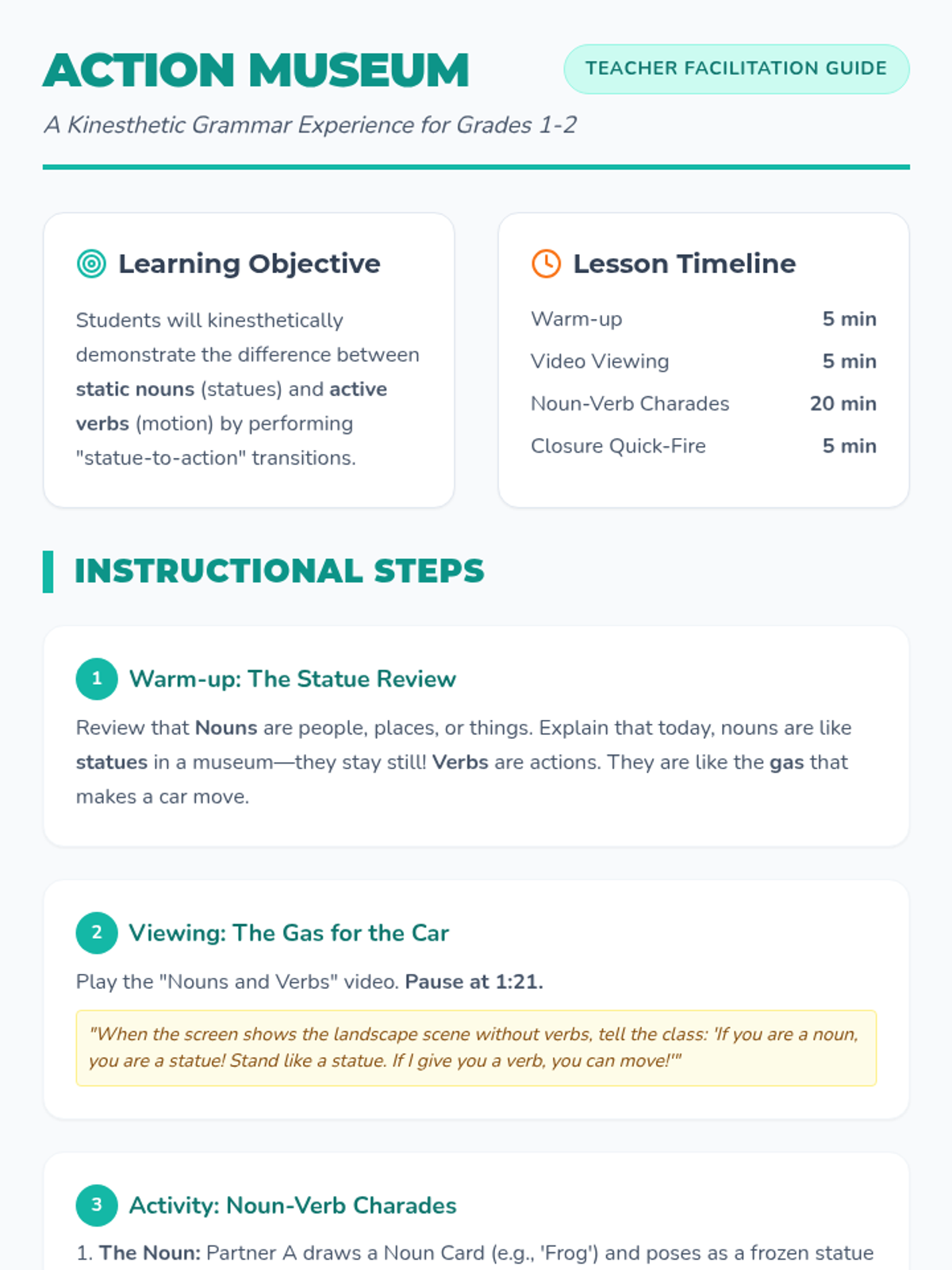 A kinesthetic grammar lesson where 1st and 2nd graders learn the relationship between nouns and verbs through movement, videos, and a 'statue' charades game.