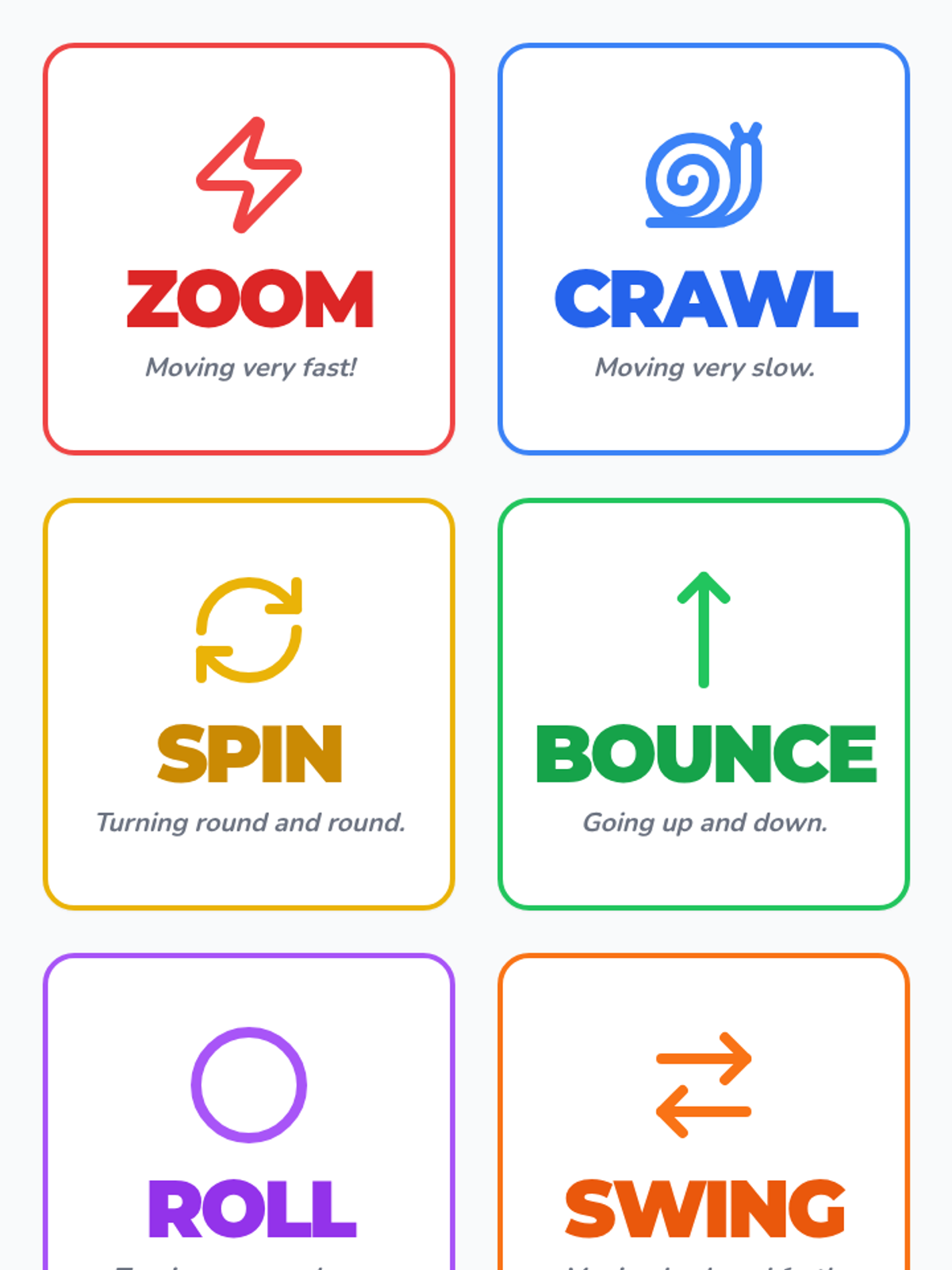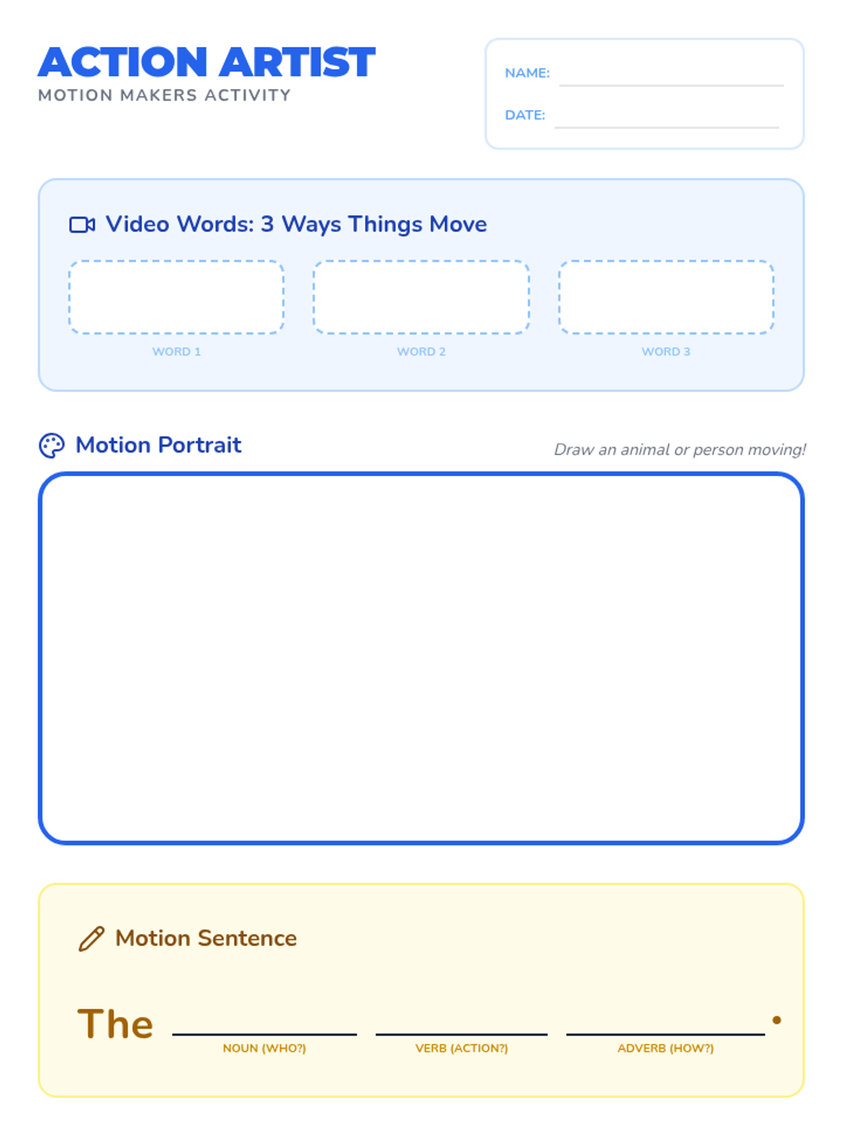 Students explore how things move through observation and descriptive writing. They will identify motion verbs and use them to construct simple sentences about animals and objects in action.