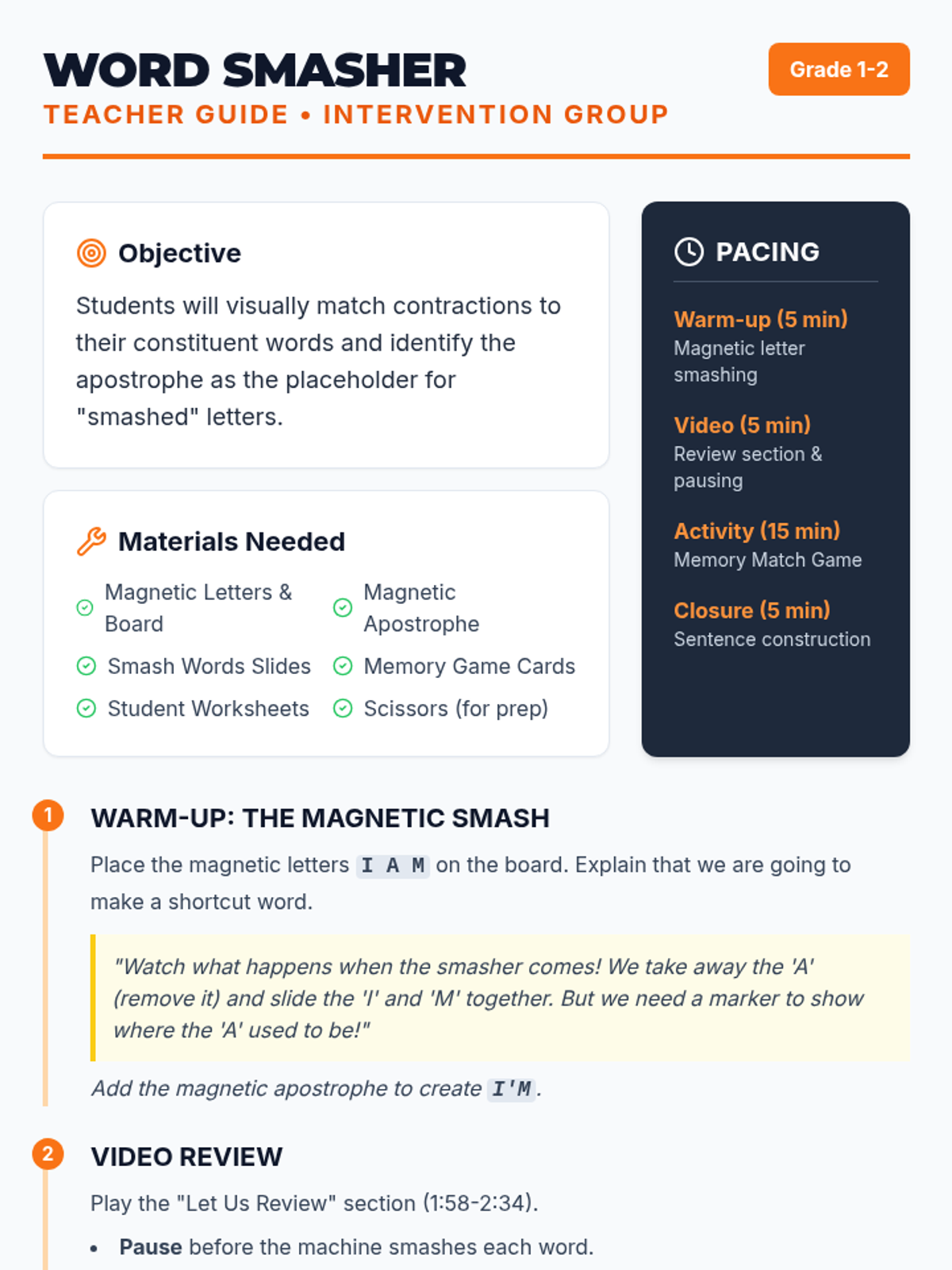 A targeted intervention lesson for 1st/2nd graders to master contractions through a 'smashing' construction theme. Includes a hands-on magnetic letter warm-up, a focused video review, and a memory matching game.