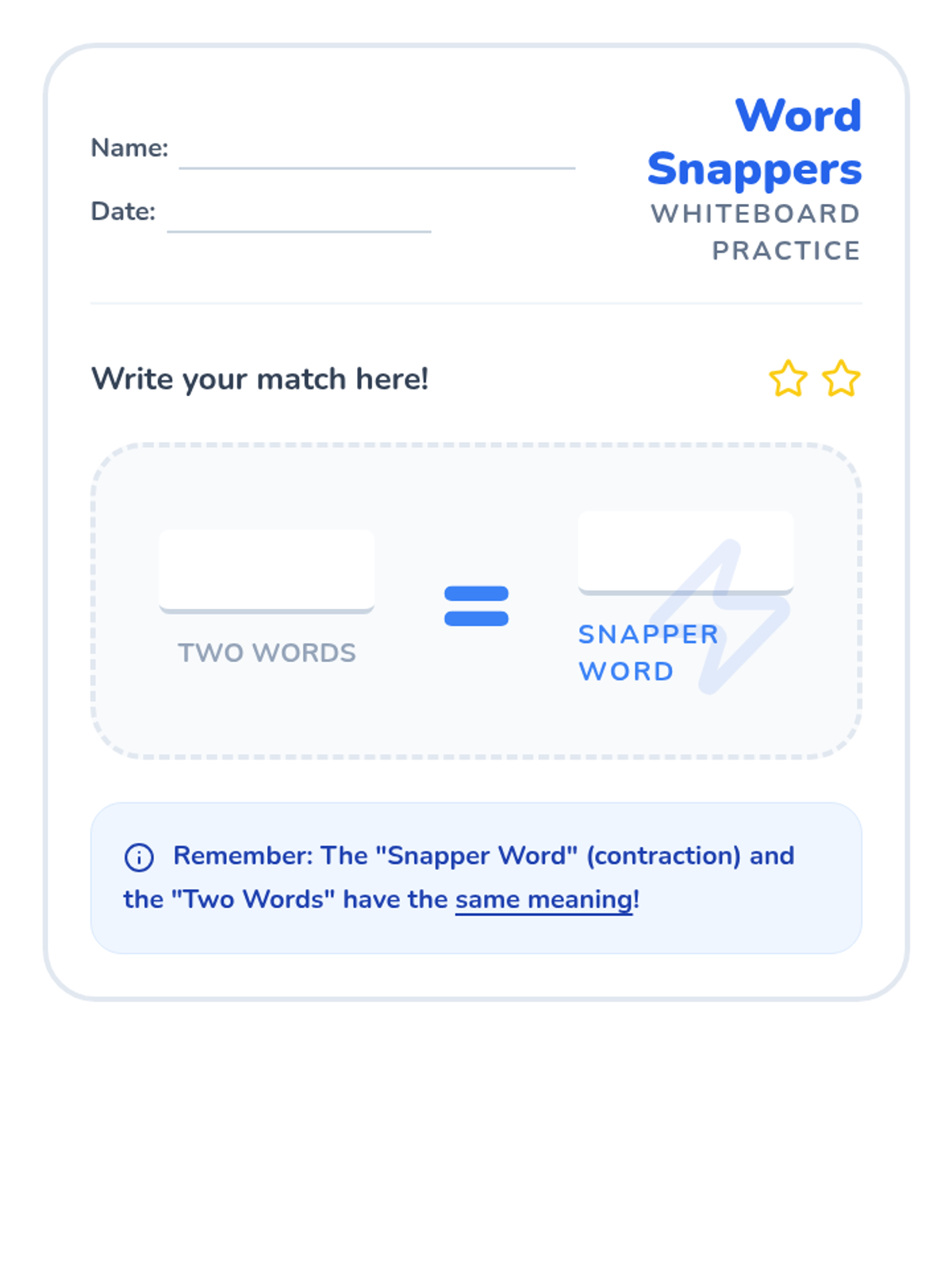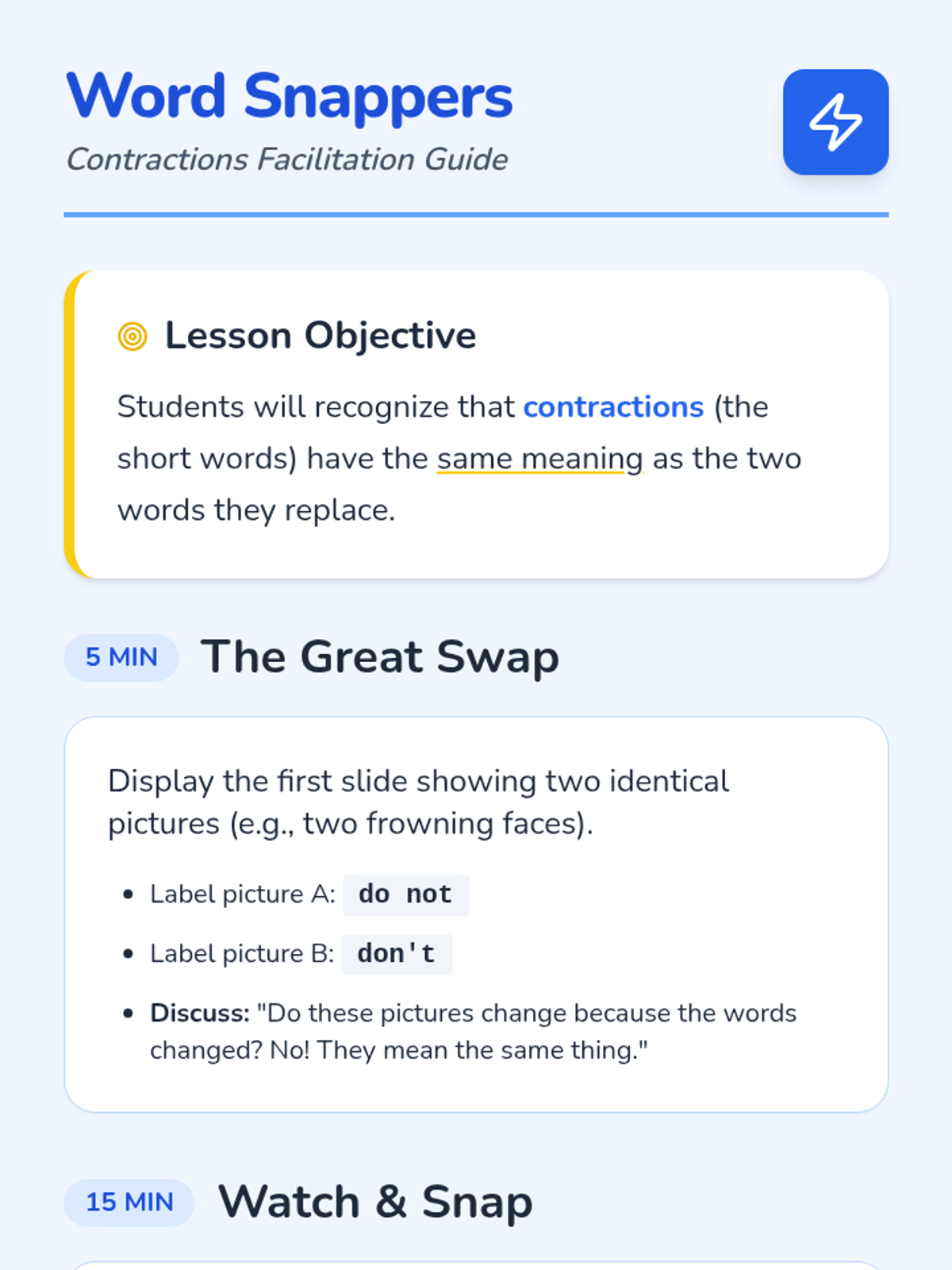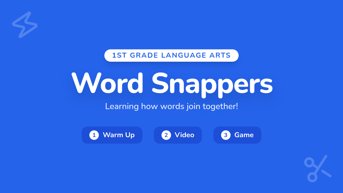 Students learn how two words can 'snap' together to form a contraction using an apostrophe, focusing on the fact that the meaning remains the same. The lesson includes a warm-up, a guided video analysis of reading examples, and a hands-on memory matching game.