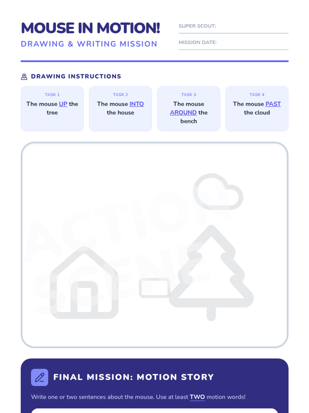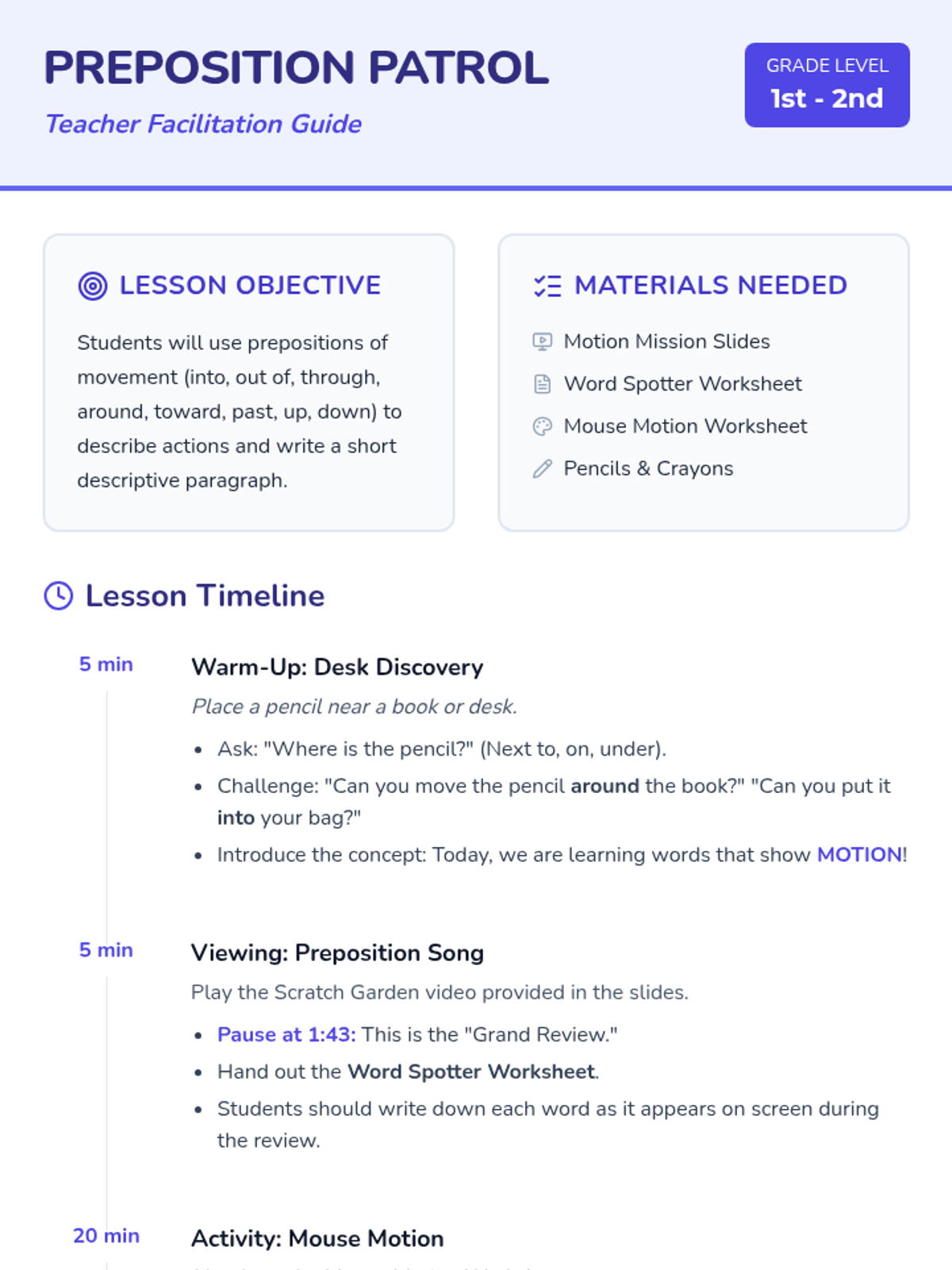 A high-energy lesson for 1st-2nd graders focusing on prepositions of movement through song, drawing, and descriptive writing. Students will identify 'into, out of, through, around, toward, past, up, and down' and apply them to create a park scene featuring a mouse's adventures.