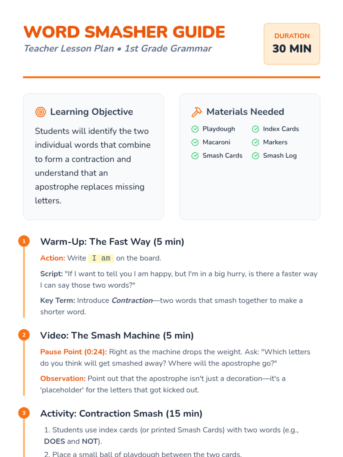 A high-energy, hands-on lesson for 1st graders to learn how contractions are formed by 'smashing' two words together, featuring a construction-themed playdough activity and the Scratch Garden video.