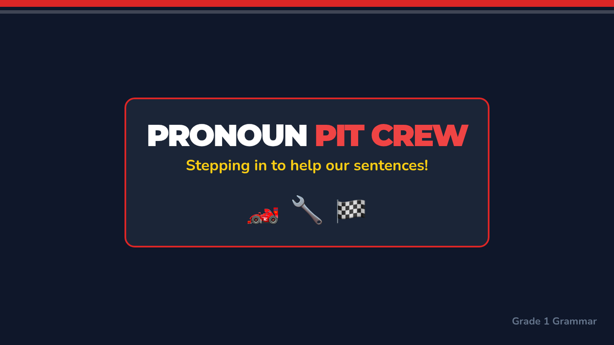 A foundational grammar lesson for 1st graders focusing on identifying and using the personal pronouns He, She, and It through a 'Pit Crew' metaphor.
