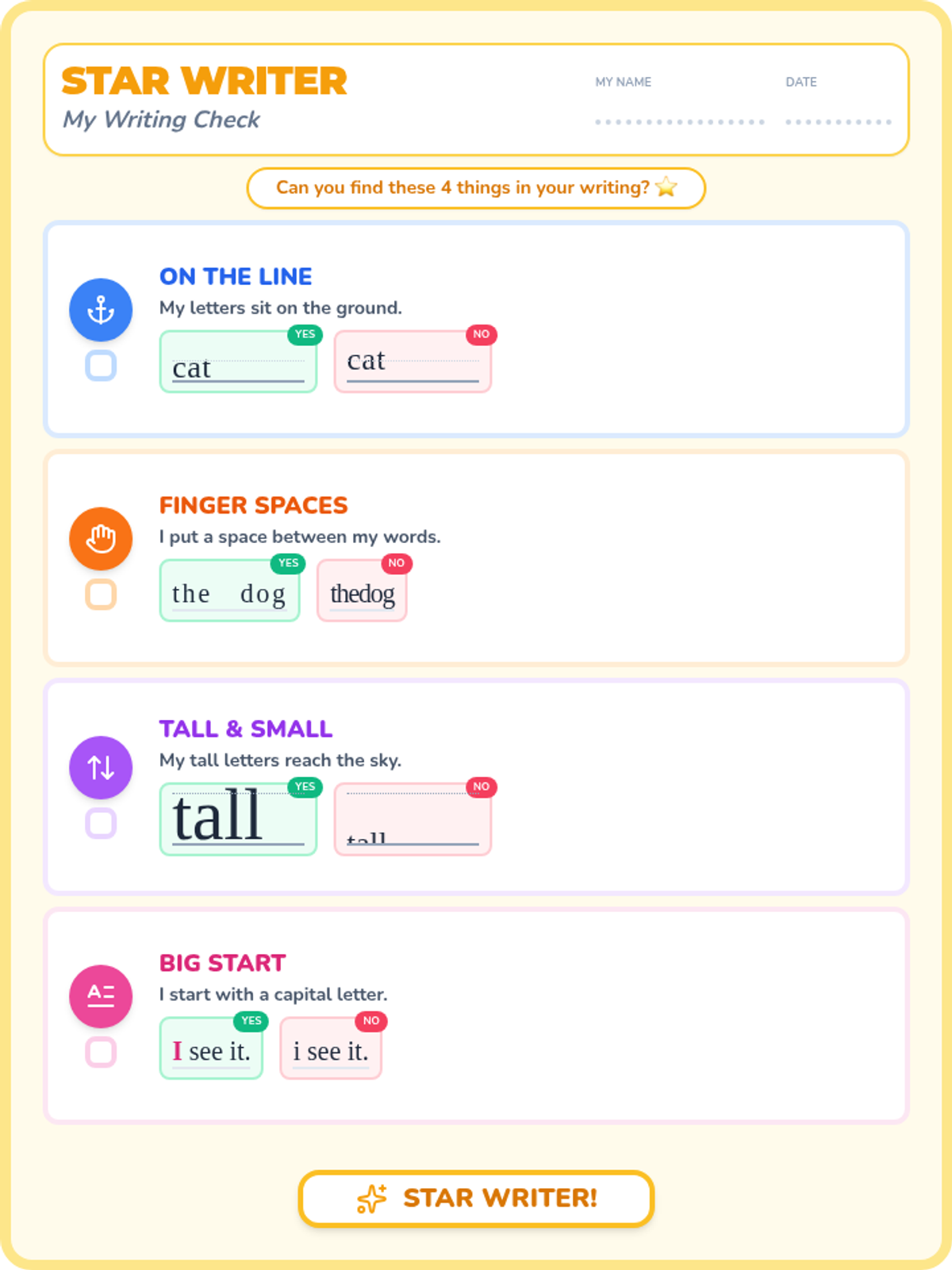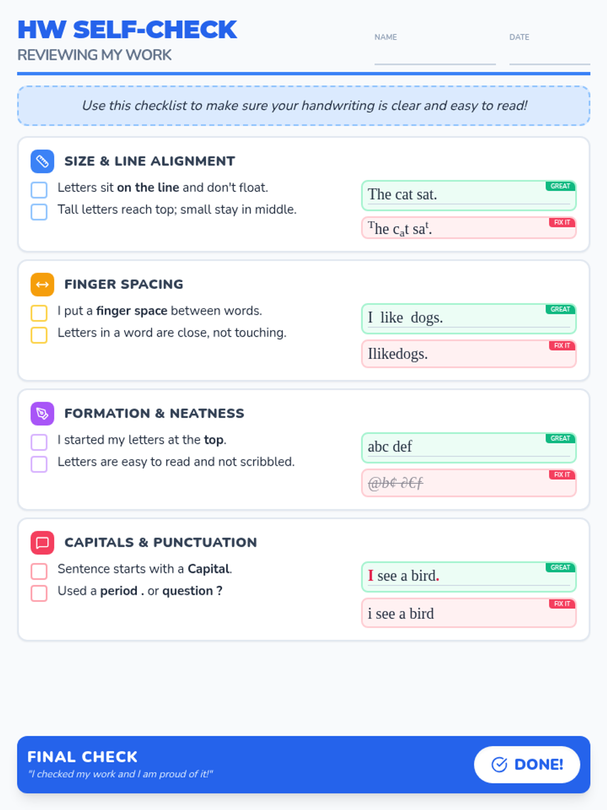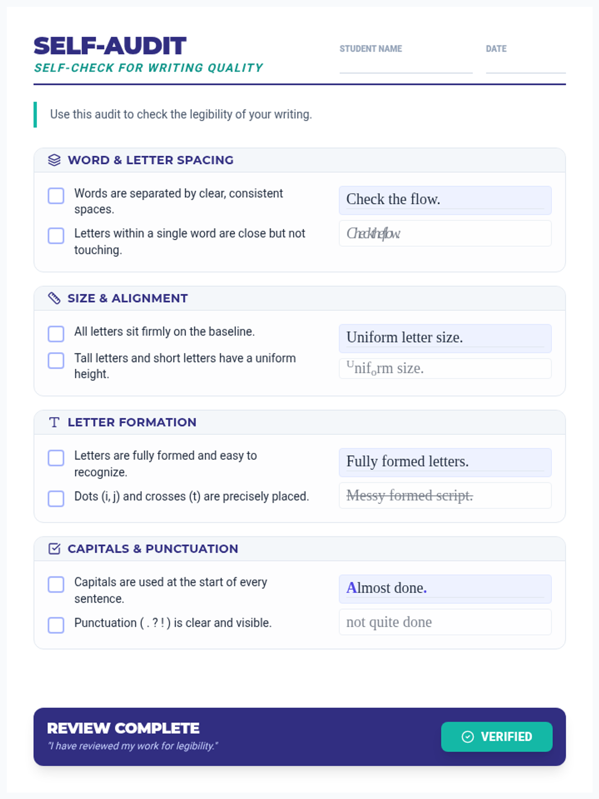 A set of handwriting self-check rubrics designed for different age groups to improve legibility and academic presentation.