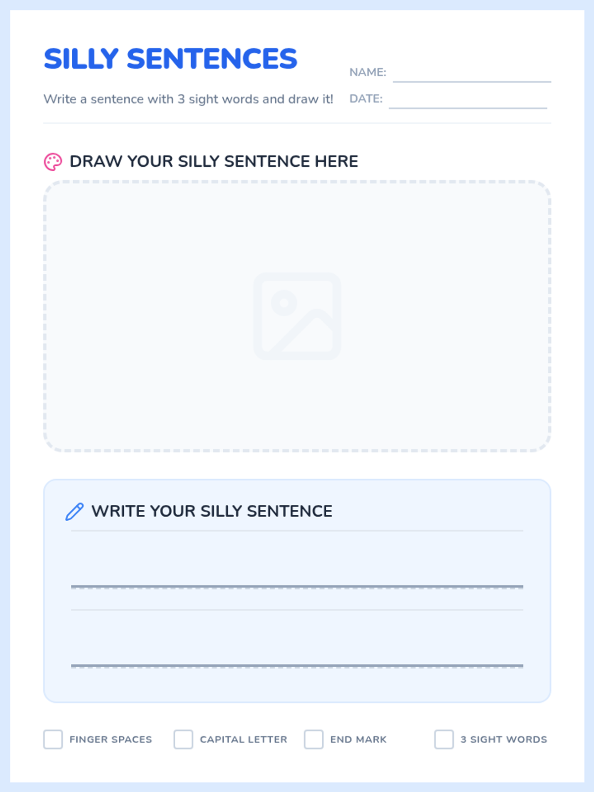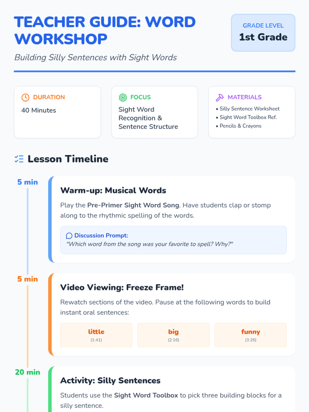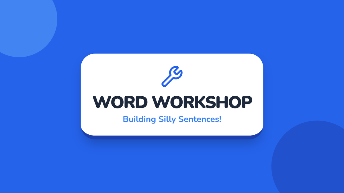 A 1st Grade creative writing lesson where students use pre-primer sight words as building blocks to create and illustrate "Silly Sentences." Students watch a rhythmic spelling video and learn to categorize words to form basic sentence structures.