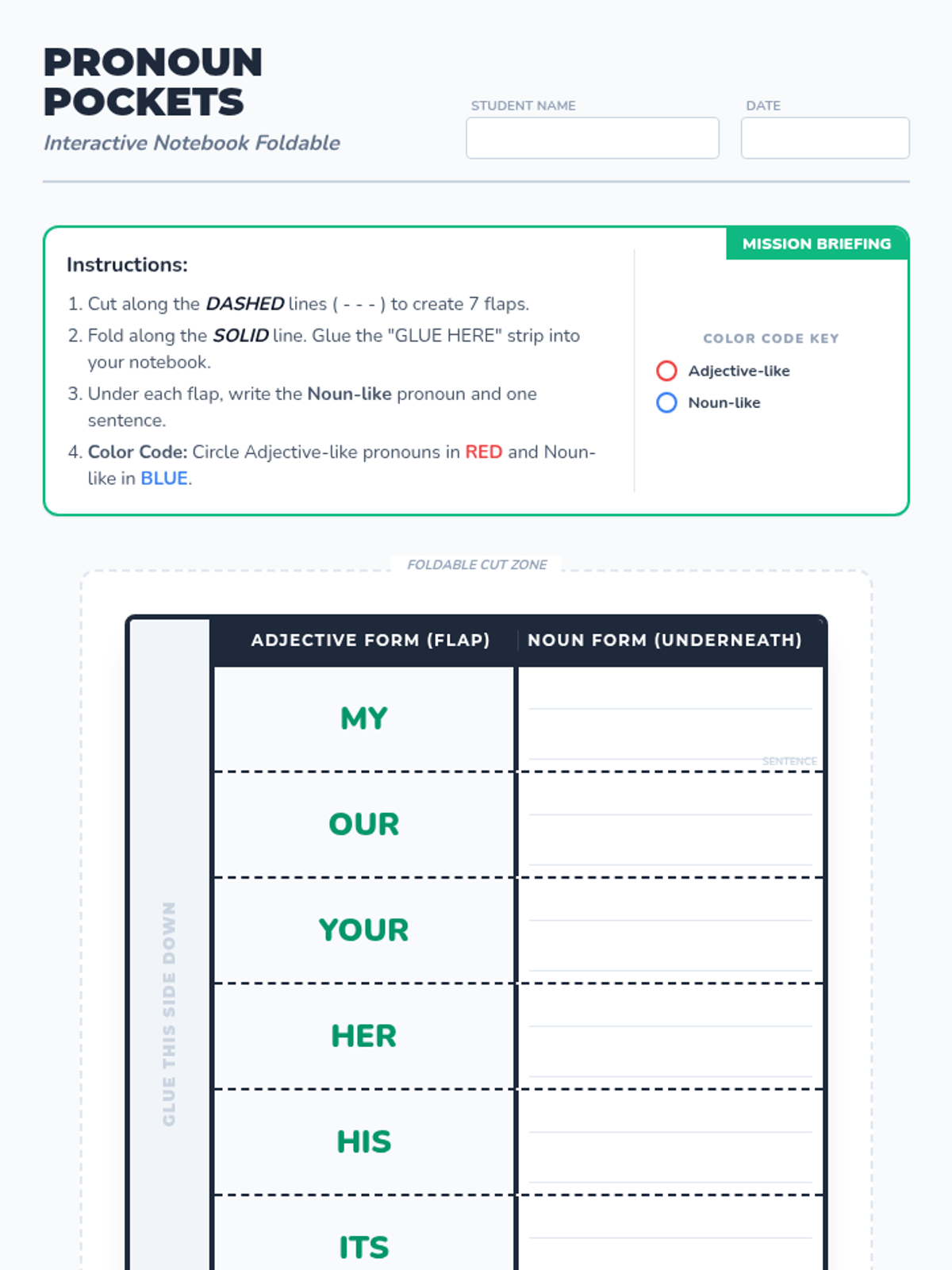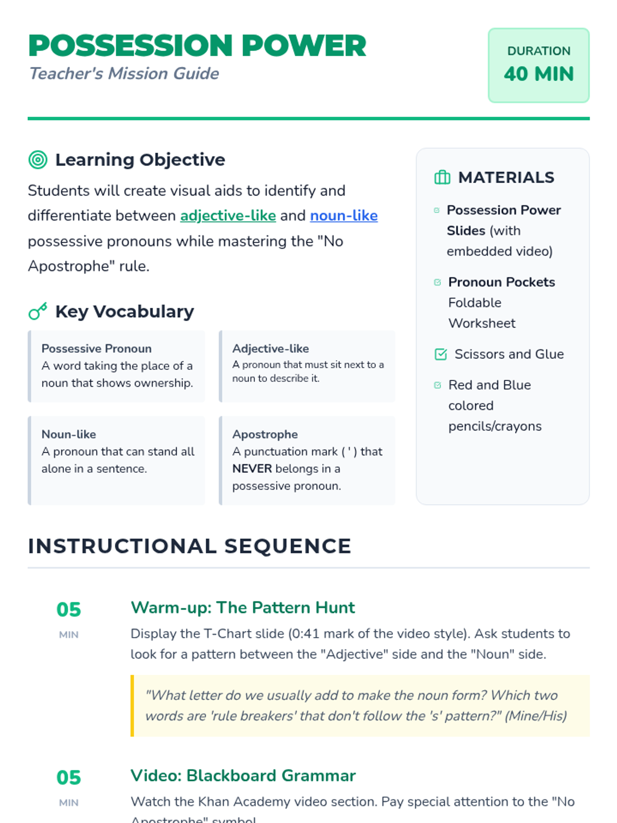 In this grammar-focused lesson, elementary students learn to distinguish between adjective-like and noun-like possessive pronouns through a visual T-chart, a Khan Academy video, and a hands-on interactive notebook foldable. The lesson emphasizes the critical 'no apostrophe' rule and includes color-coded practice for identifying pronoun functions.