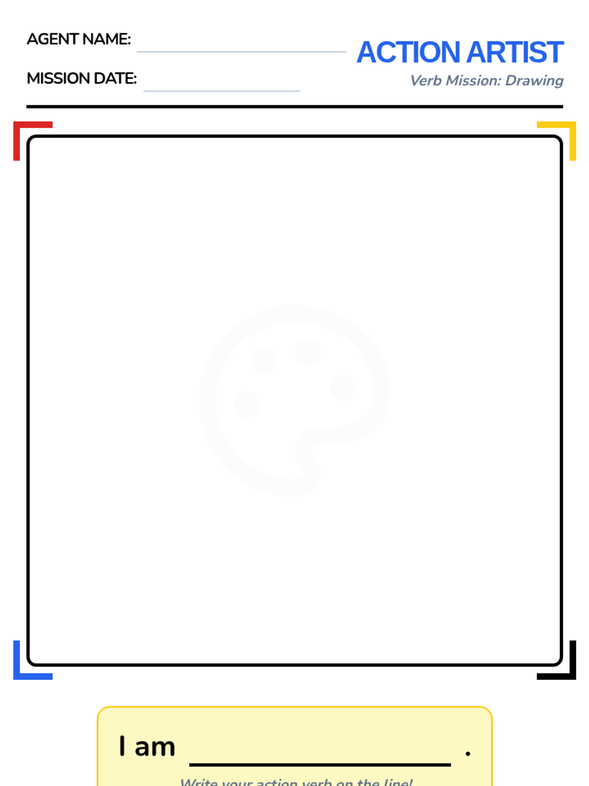 An art-themed writing lesson focusing on describing colors and creative actions.