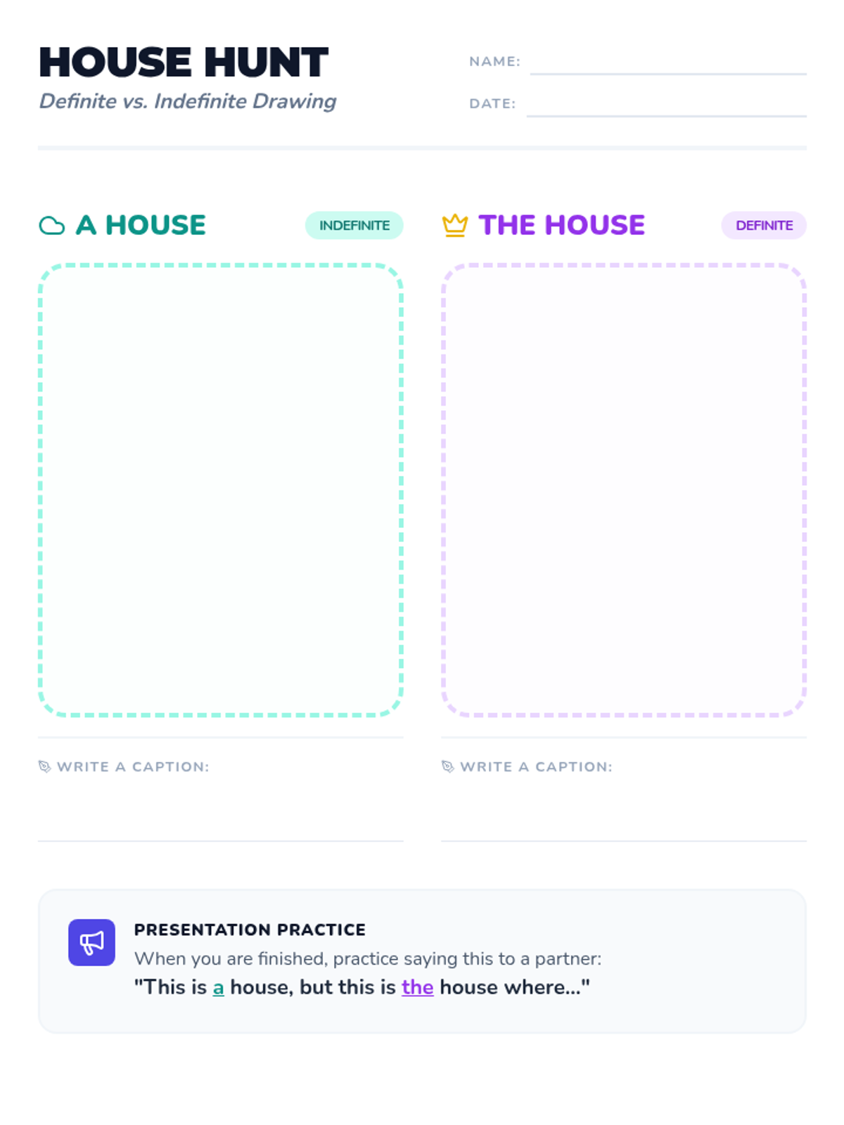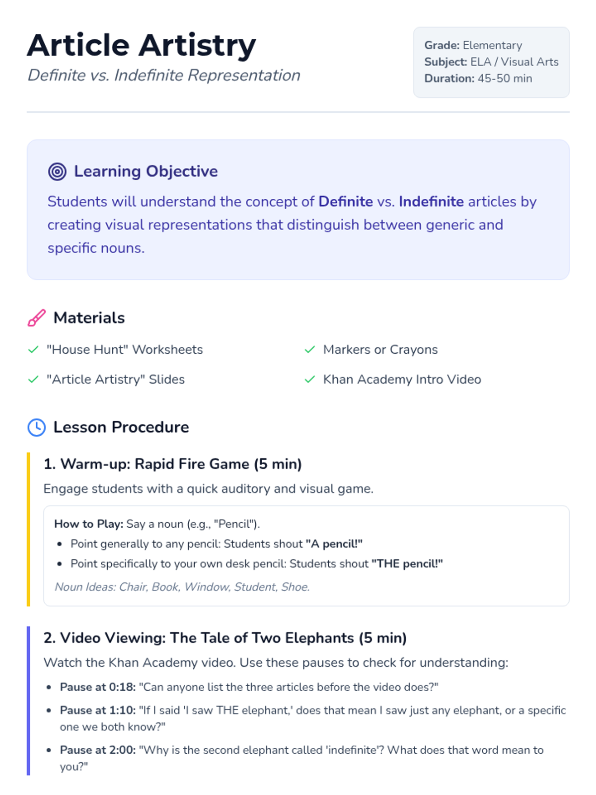 An art-integrated grammar lesson where students explore the difference between definite (the) and indefinite (a/an) articles by drawing generic and specific houses. Includes a video-based discussion and a rapid-fire game.