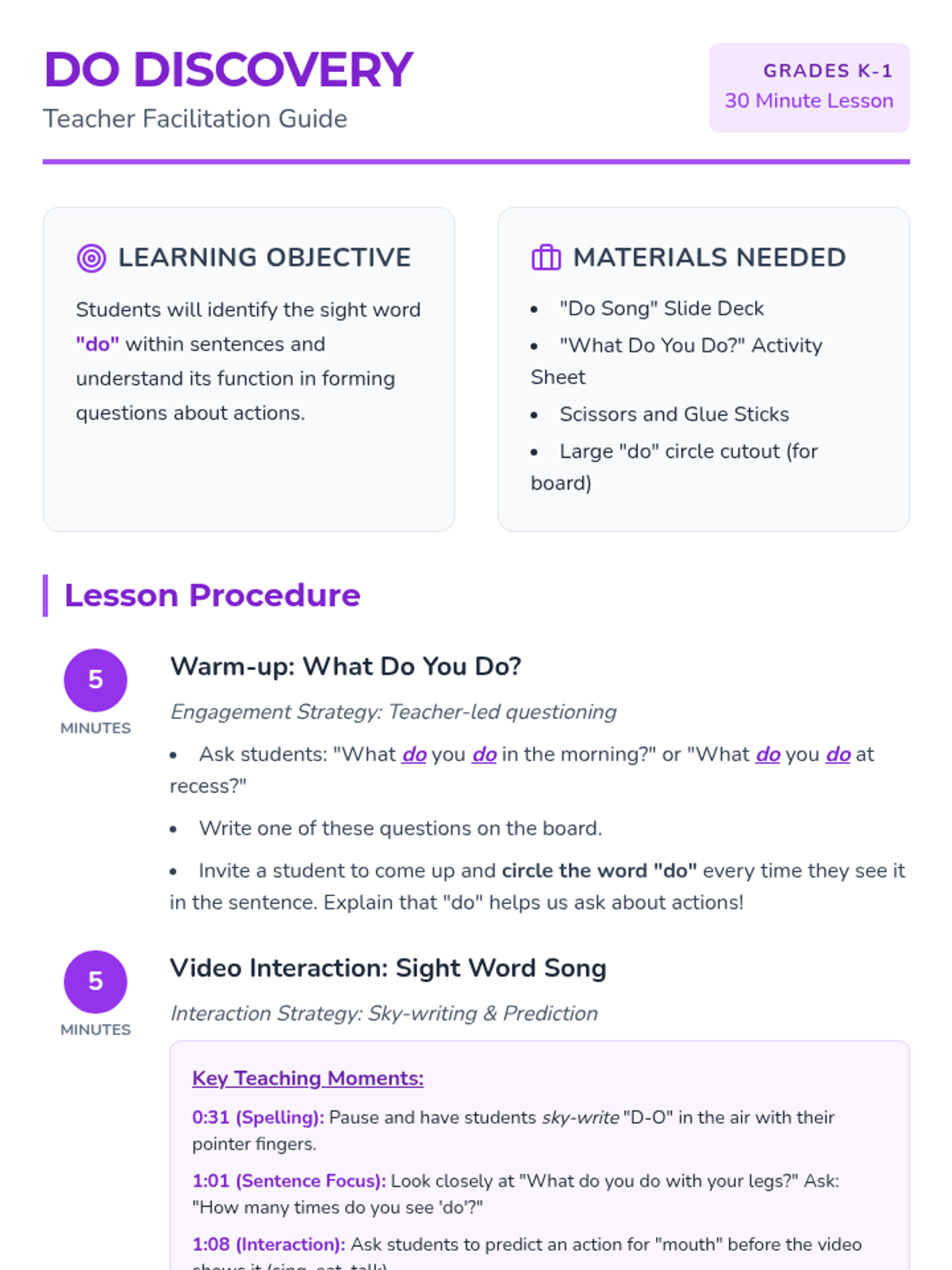 A Kindergarten and 1st Grade lesson focused on identifying the sight word 'do' and understanding its role in questions through music, movement, and hands-on sentence building.