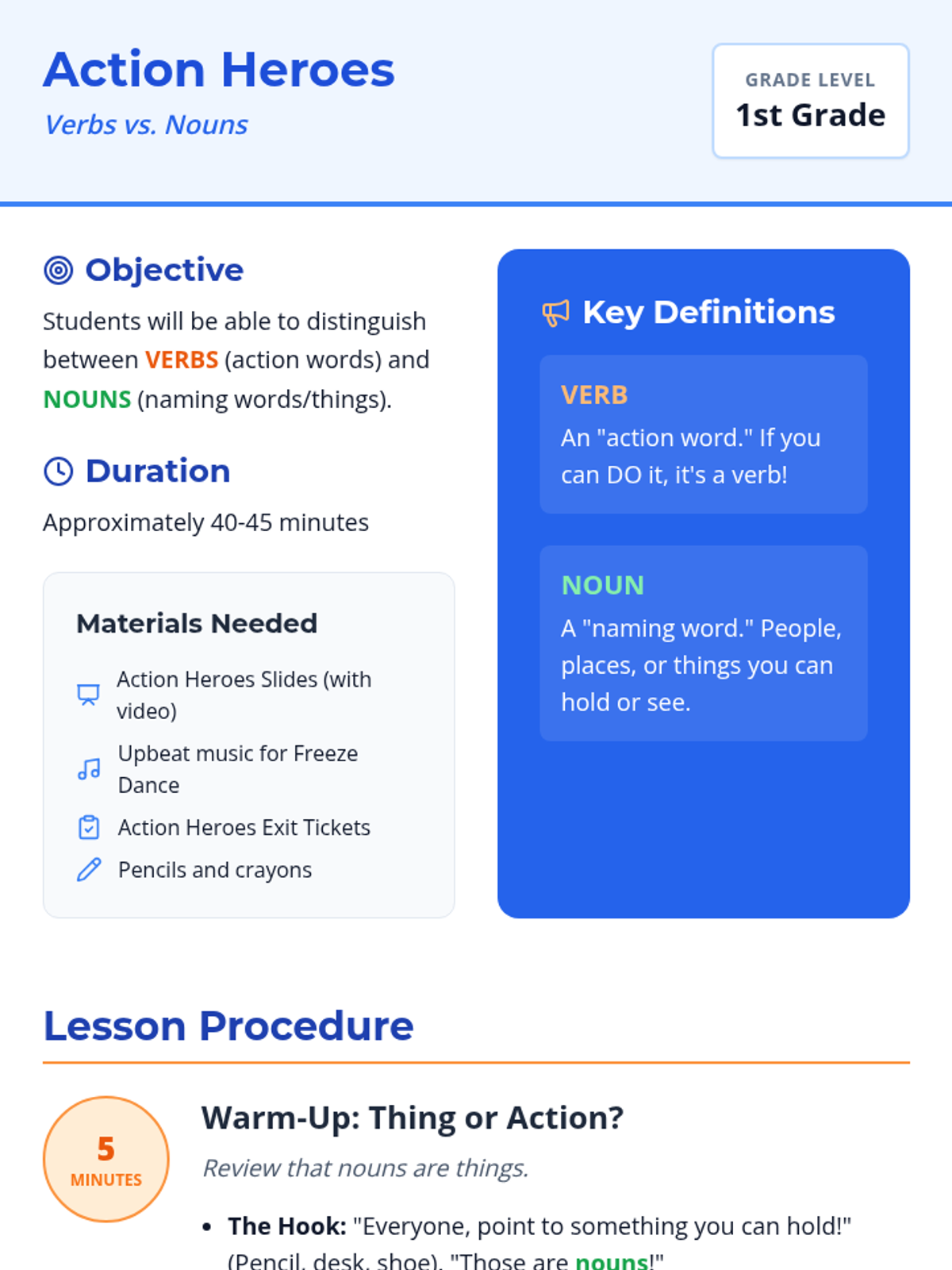 A high-energy 1st grade lesson that uses music and movement to help students distinguish between action verbs and naming nouns.