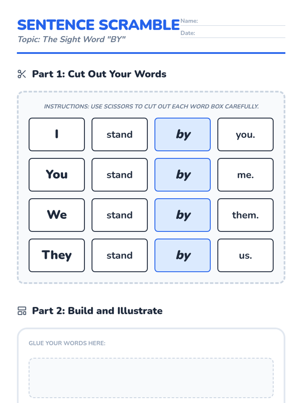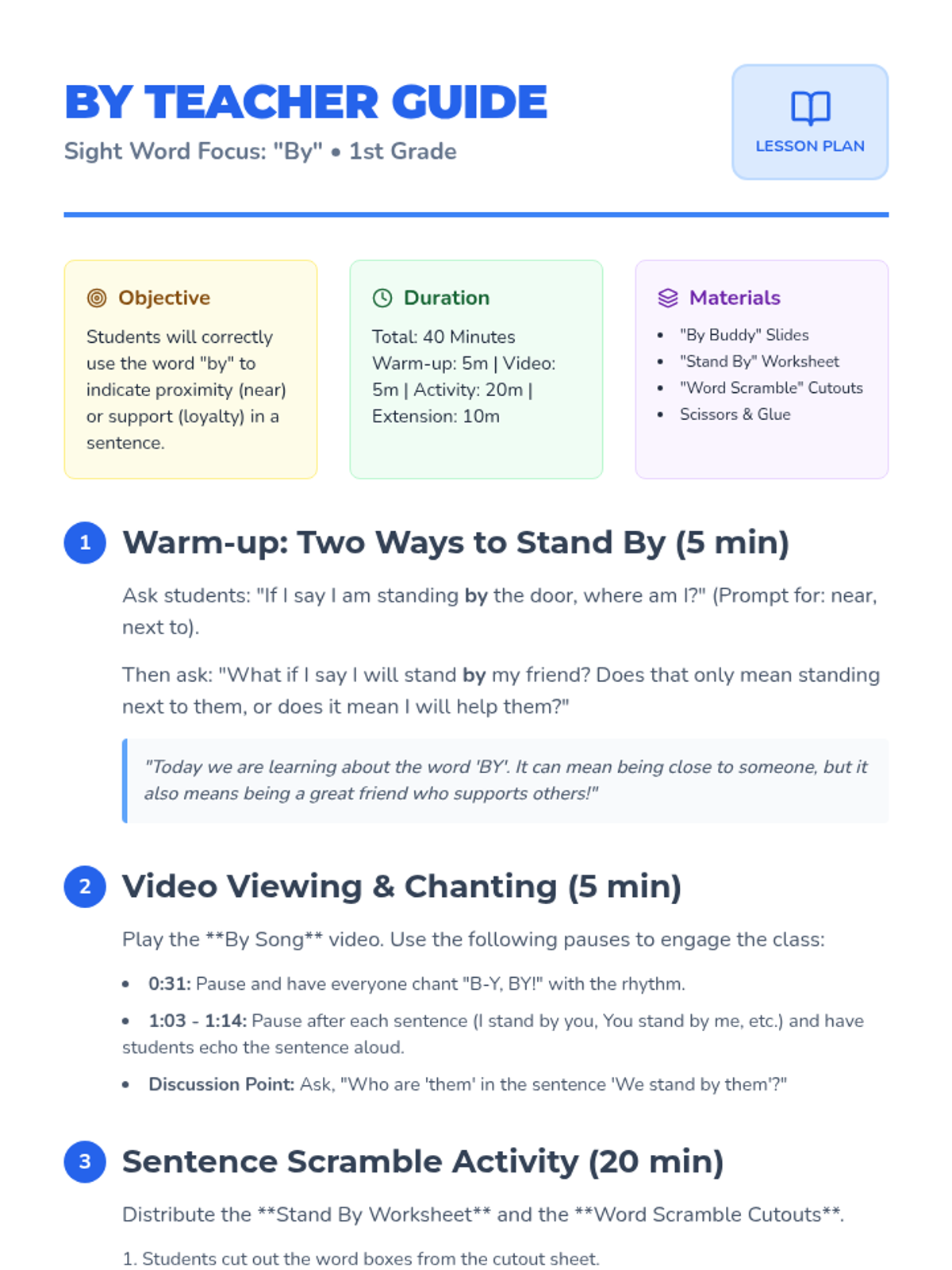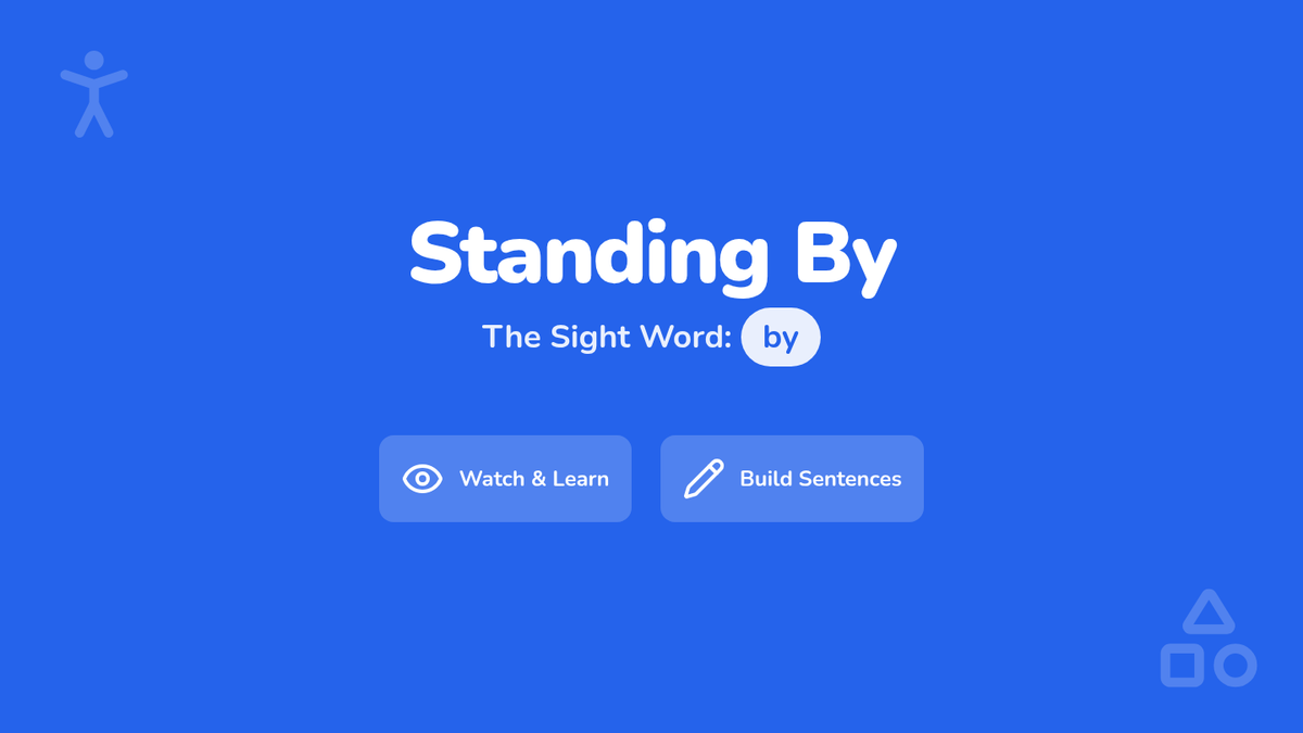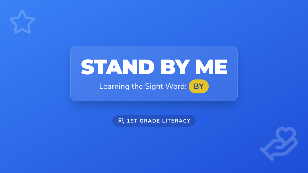 A 1st Grade English lesson focusing on the sight word and preposition 'by' to indicate proximity and support. Students will watch a catchy song, practice spelling, and build sentences from the lyrics.