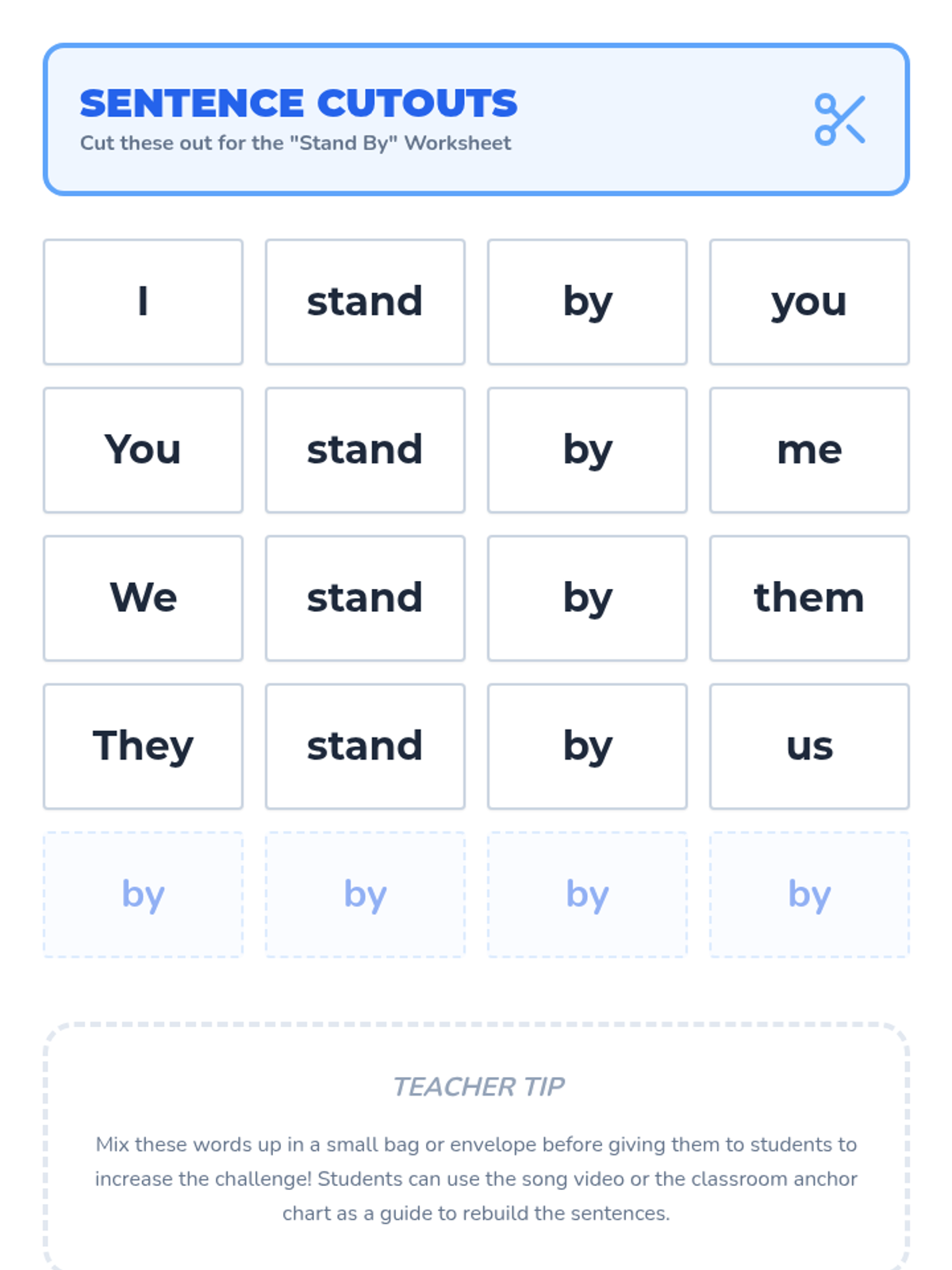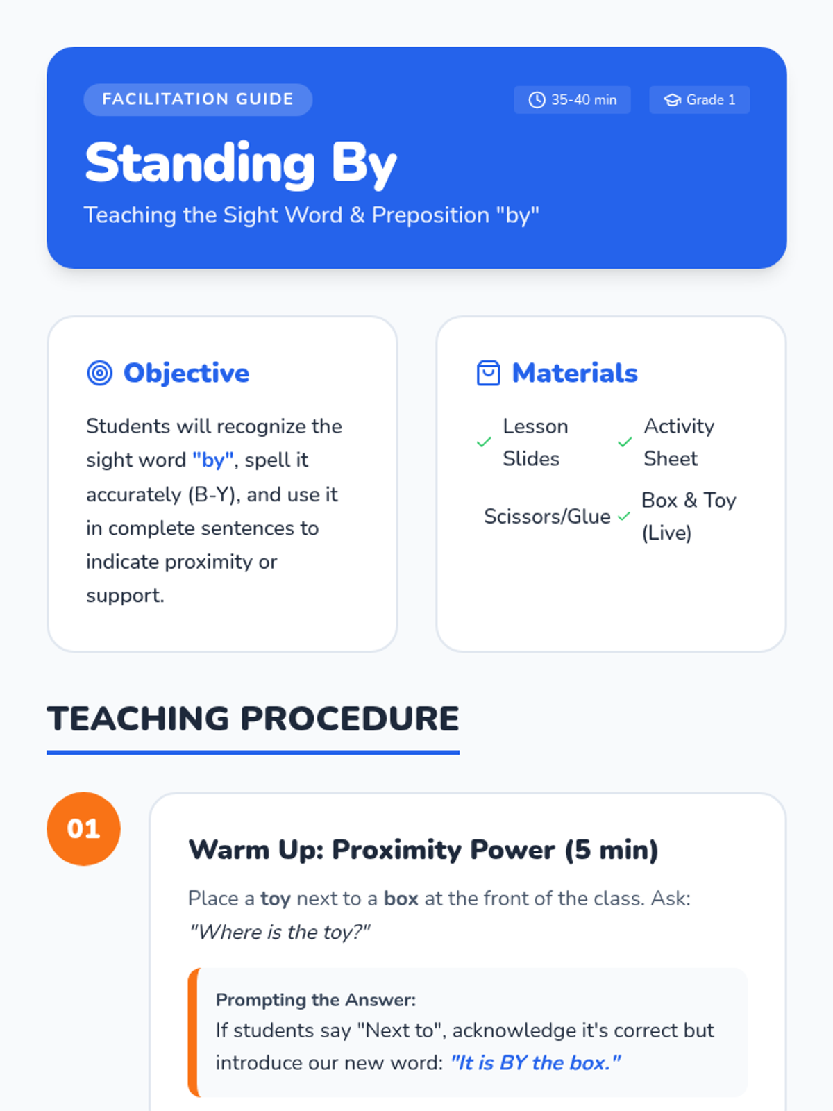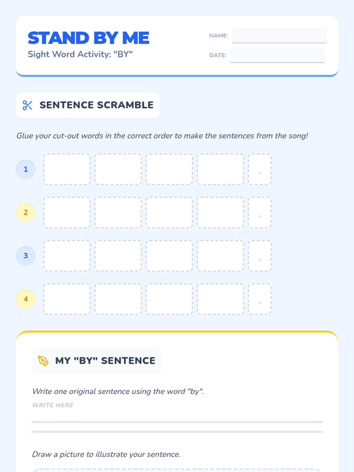 A 1st Grade English lesson focusing on the sight word and preposition 'by' to indicate proximity and support. Students will watch a catchy song, practice spelling, and build sentences from the lyrics.