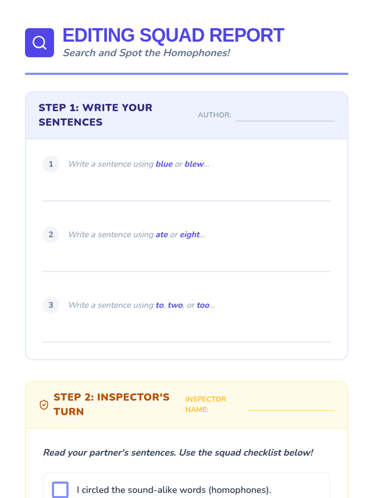Students create their own homophone 'mysteries' for partners to solve, demonstrating mastery through writing and peer review.