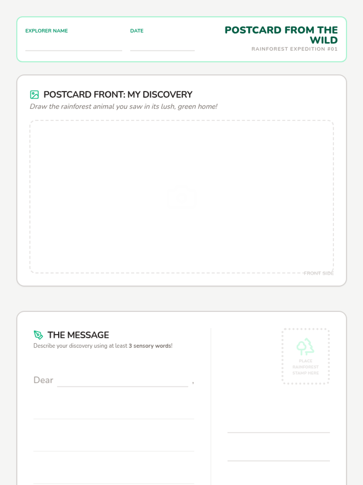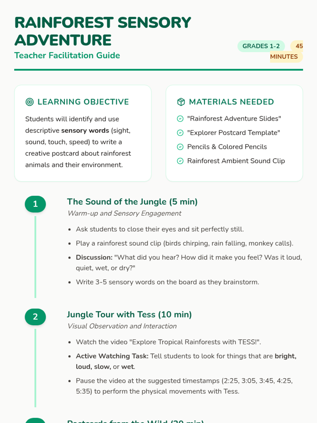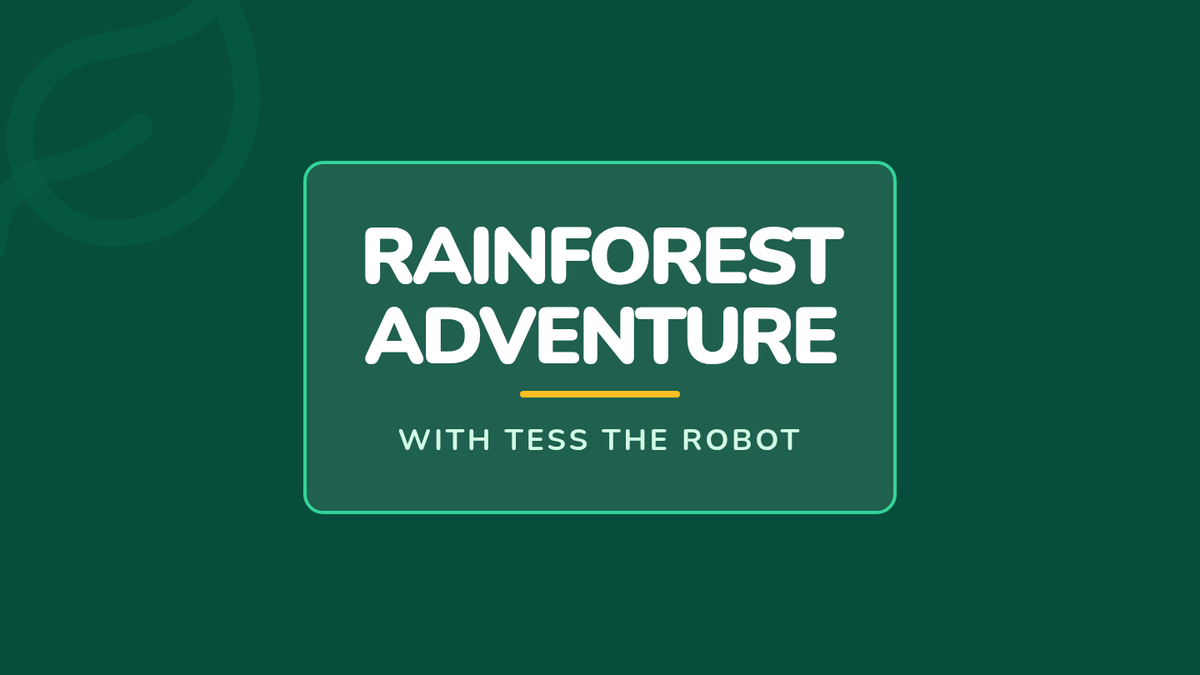 A 1st/2nd grade lesson focused on using sensory words to describe the rainforest, featuring a guided video tour with Tess the Robot and a creative postcard writing activity.