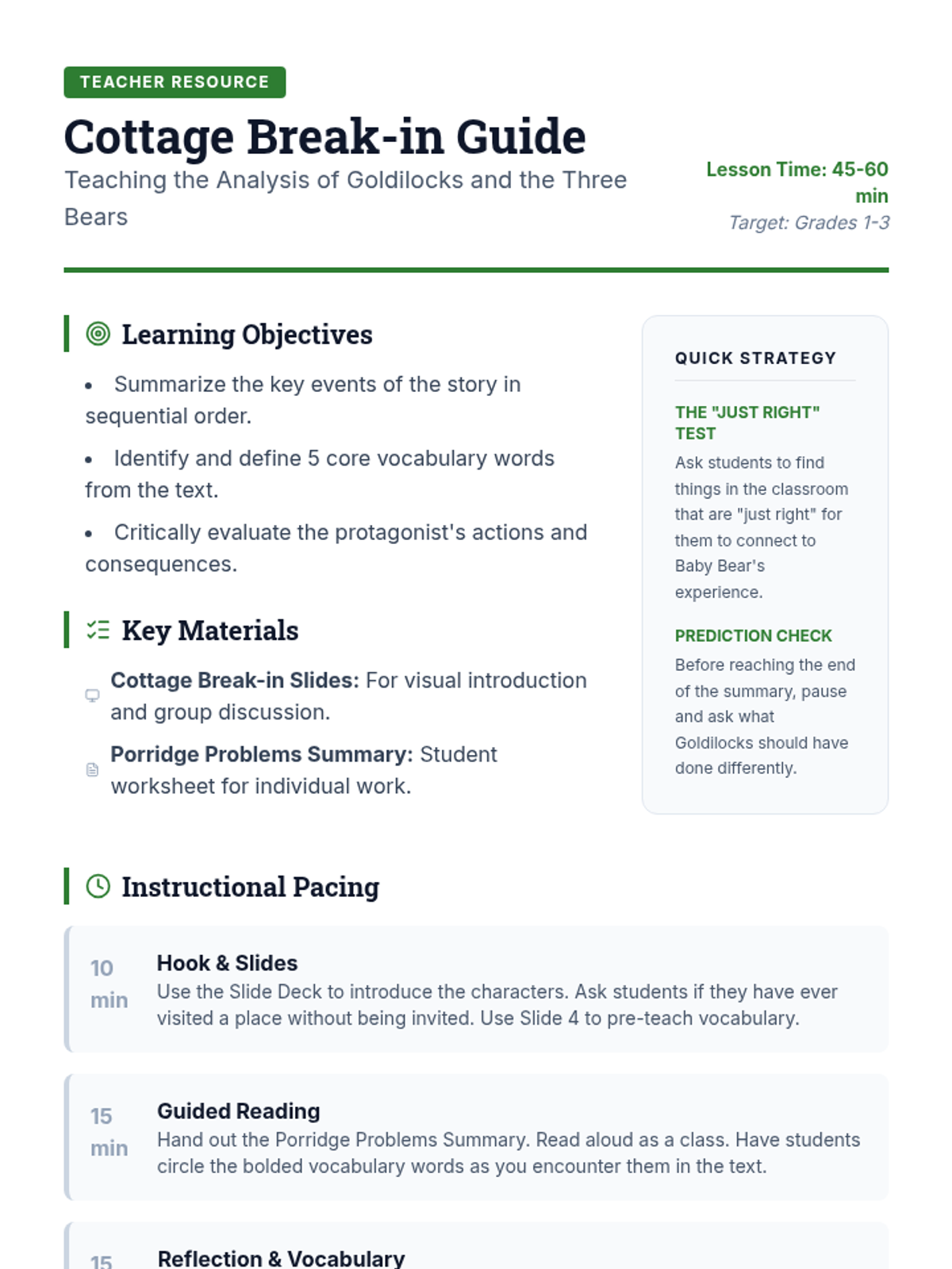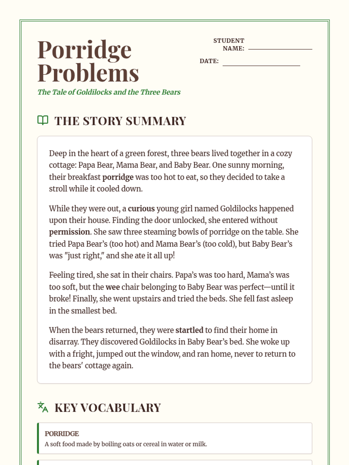 A focused look at the classic tale of Goldilocks and the Three Bears, featuring a structured summary and key vocabulary development.