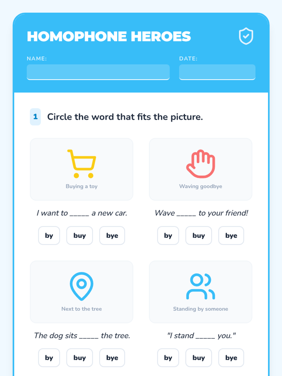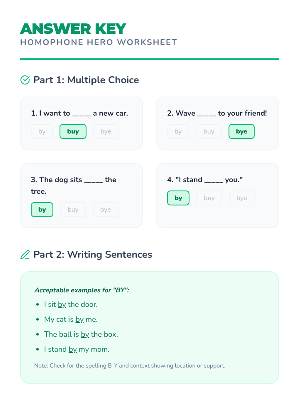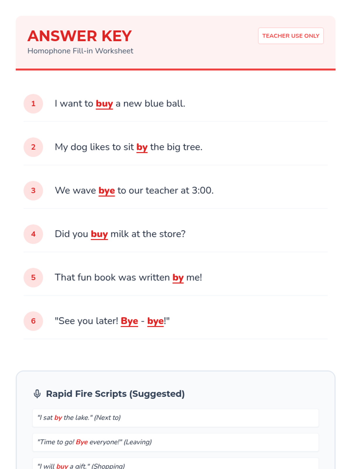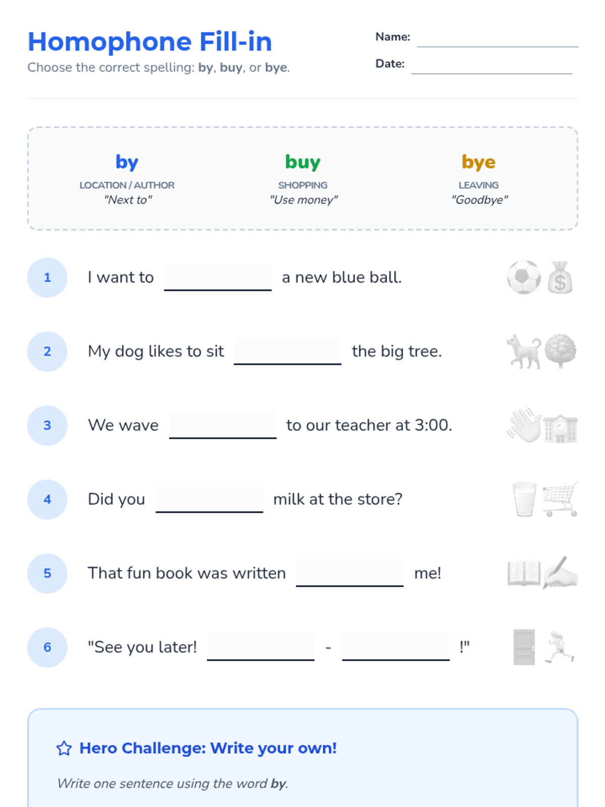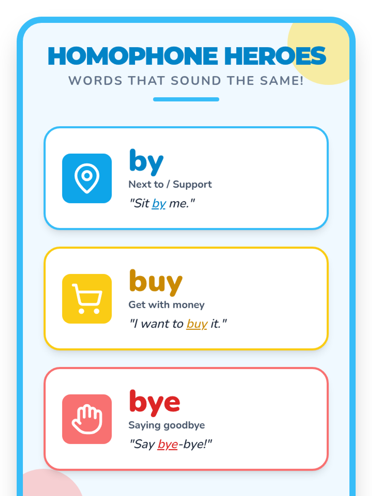 A fun, interactive lesson for 1st graders to master the homophones by, buy, and bye through song, movement, and sentence building.