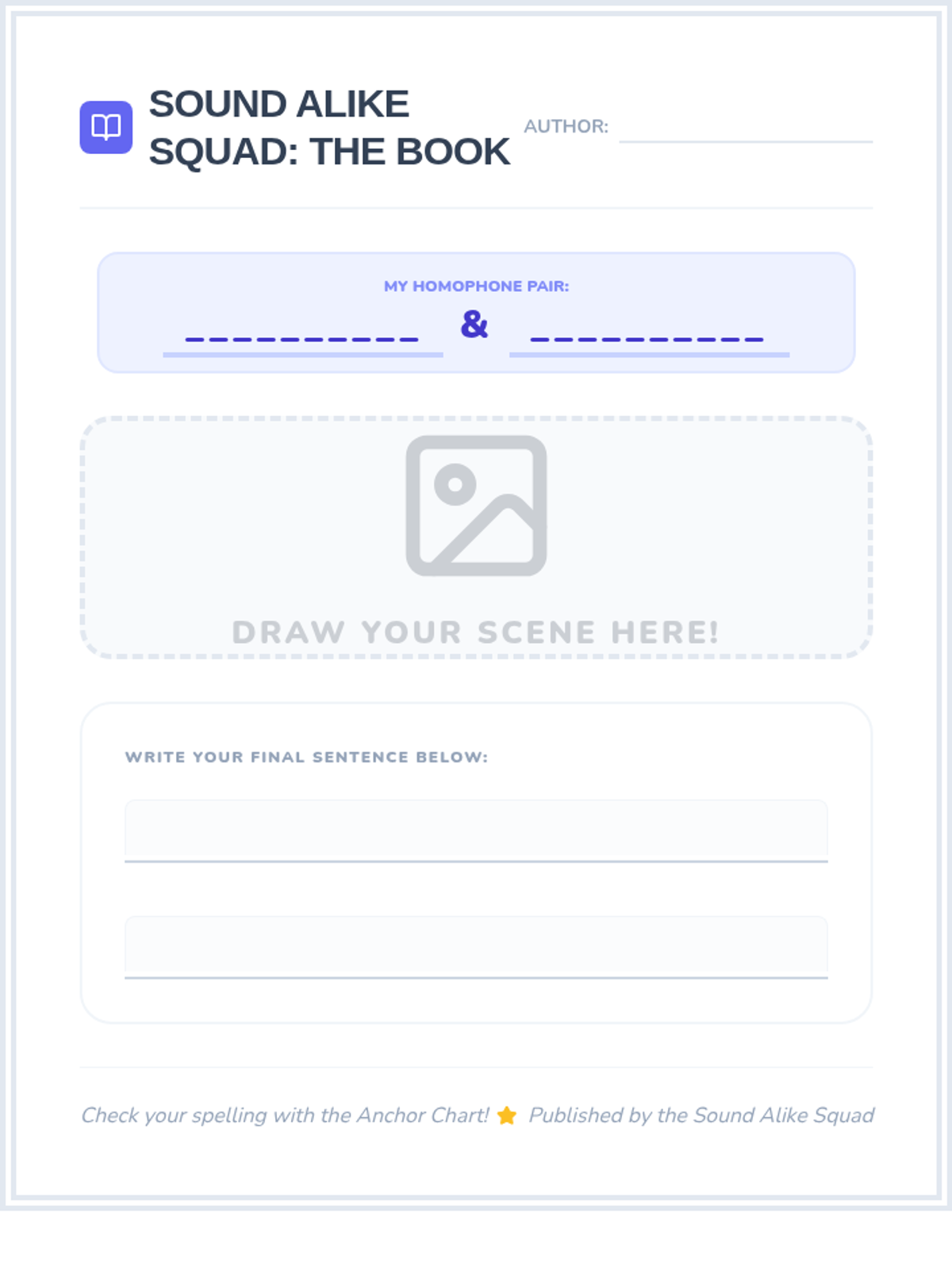 Students finalize an illustrated page for a specific homophone pair to be bound into a class book, celebrating their learning.