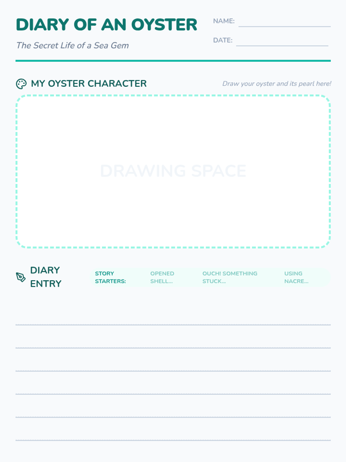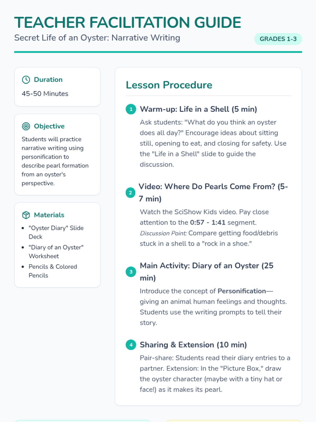 A narrative writing lesson where students step into the shell of an oyster. They learn how pearls are formed through a SciShow Kids video and practice personification by writing a diary entry about an uncomfortable bit of debris and the creation of a pearl.