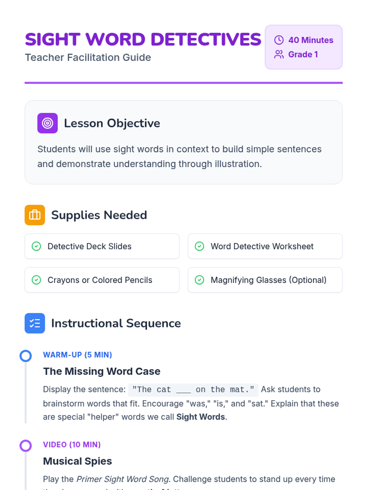 A high-energy, music-based lesson where 1st graders learn to identify Primer sight words and use them to build complete sentences through interactive movement and a sentence-scramble activity.