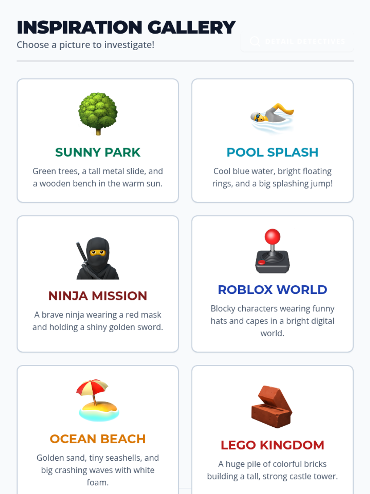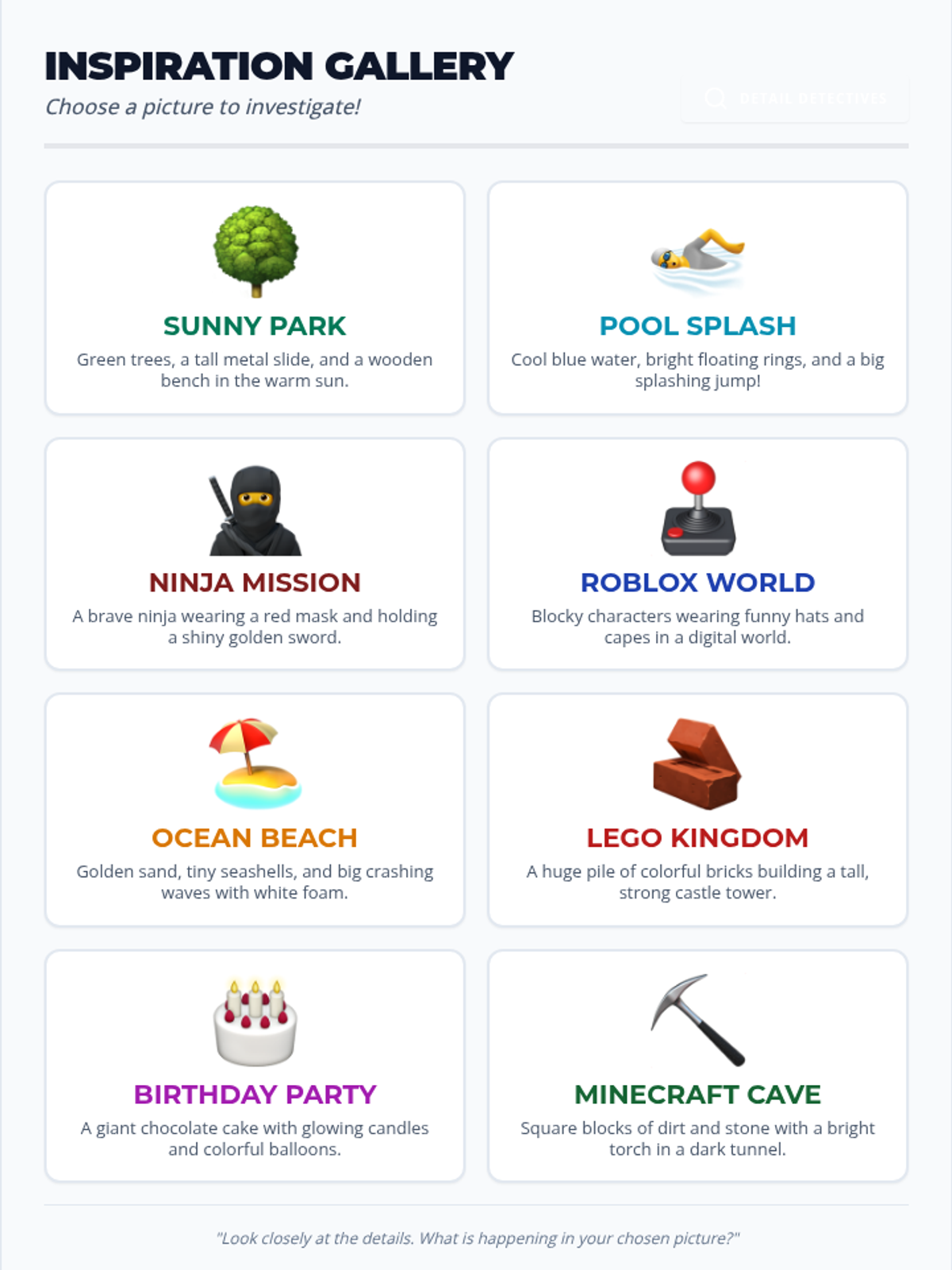 Students bring a favorite object from home (or choose one from class) and practice describing it using sensory details rather than just its name. They create a simple 'riddle poem' for the class to guess the object.