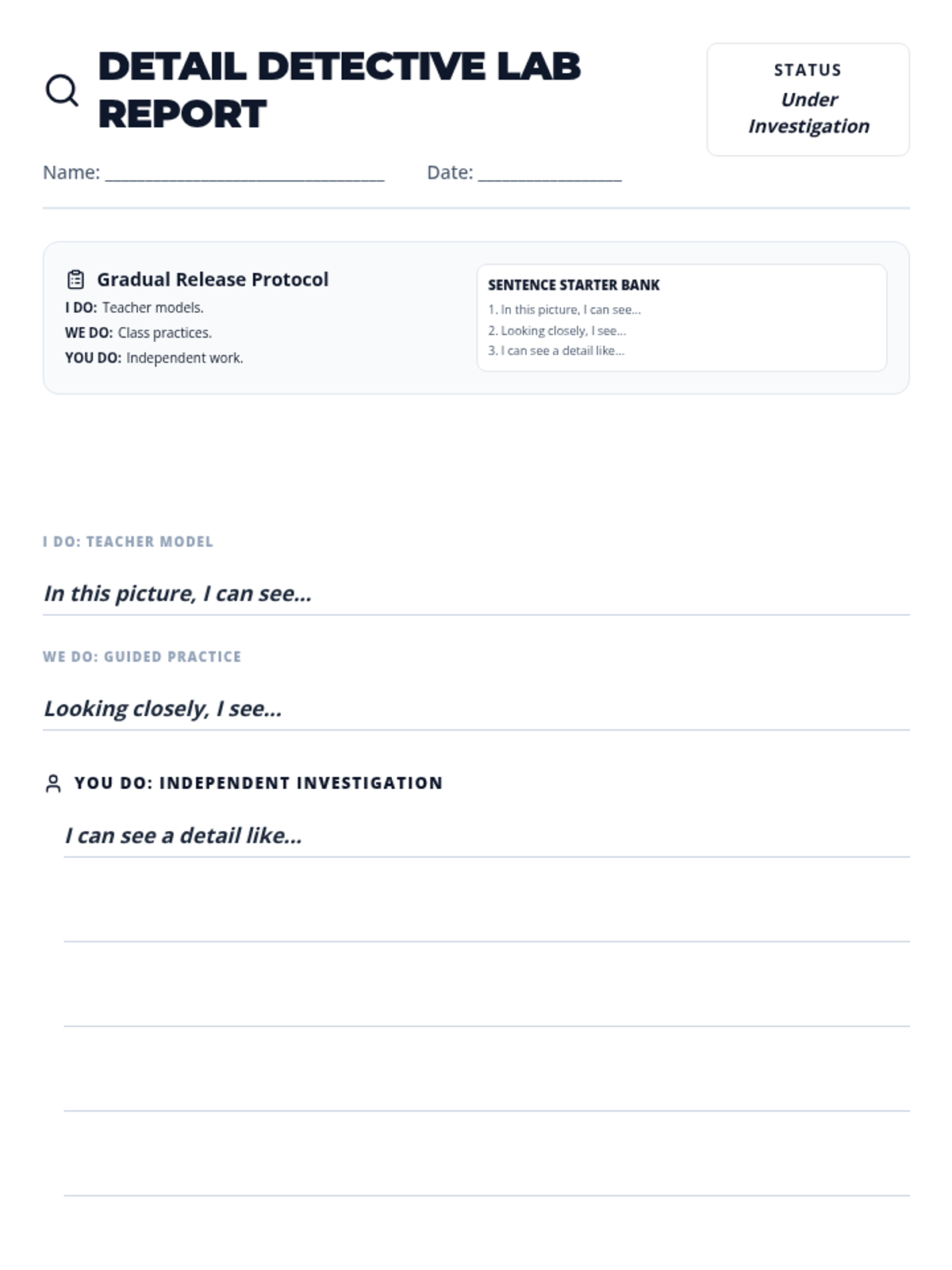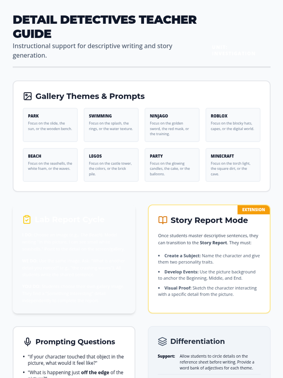 A lesson focused on developing descriptive language skills by observing images and generating detailed sentences using structured scaffolds.