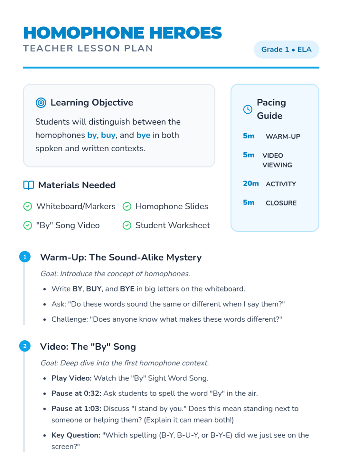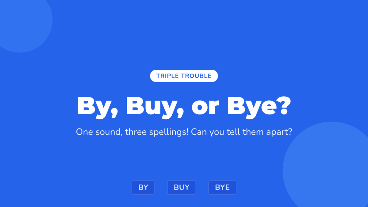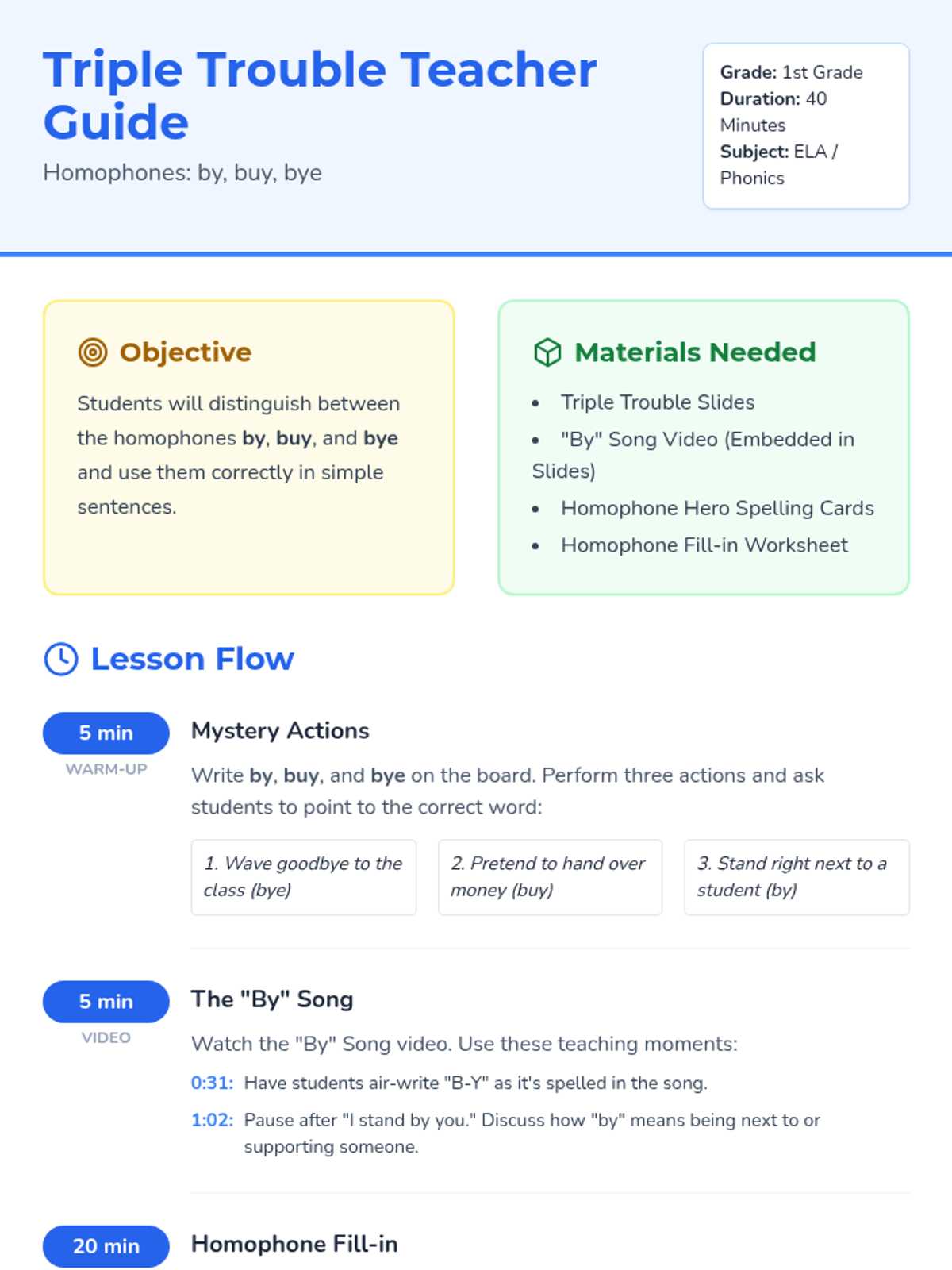 A 1st-grade lesson focused on distinguishing between the homophones by, buy, and bye using music, visual aids, and interactive practice.