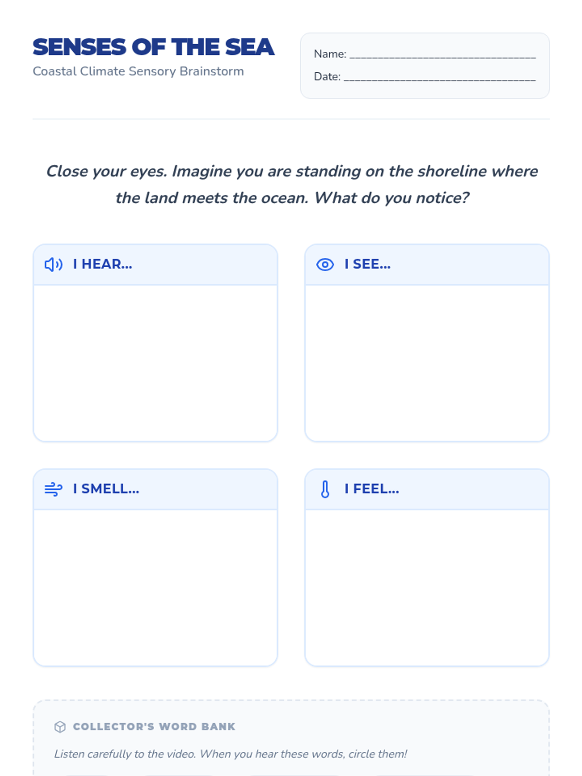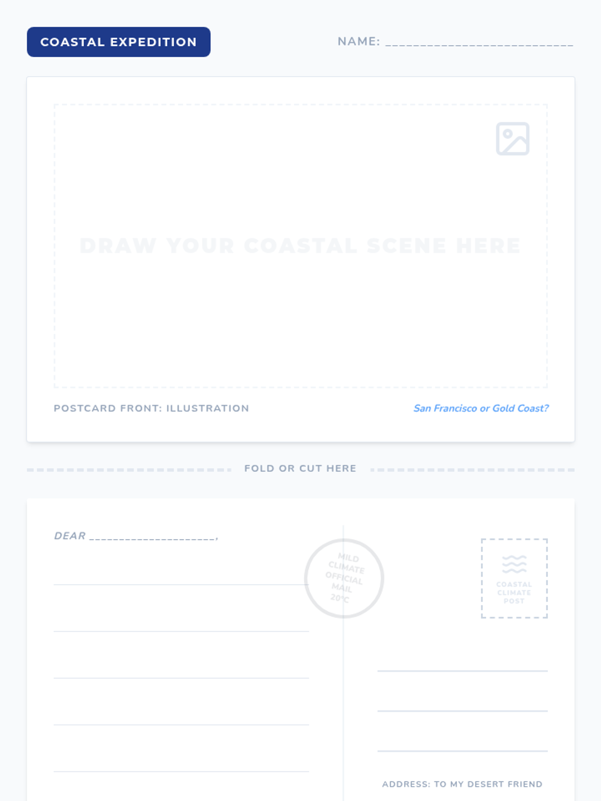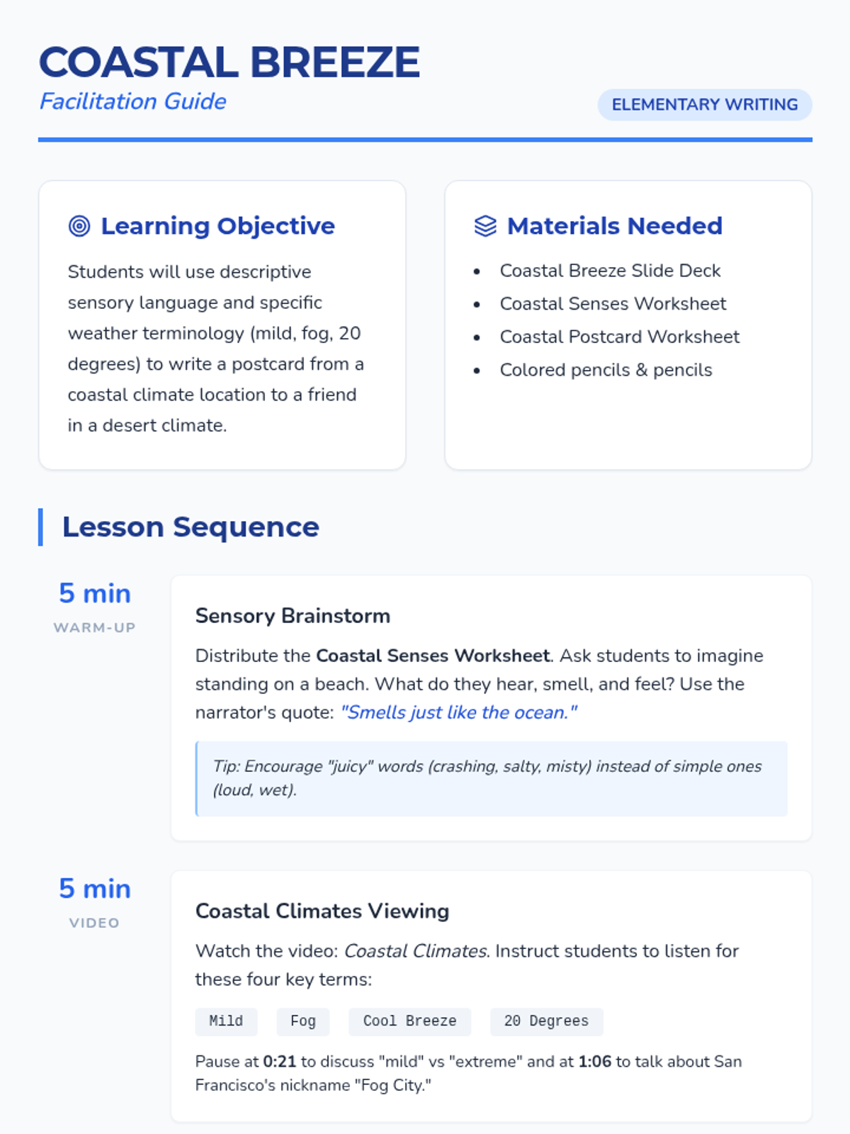 A writing-focused lesson where elementary students explore coastal climates through a sensory lens, culminating in a descriptive postcard written from San Francisco or the Gold Coast.