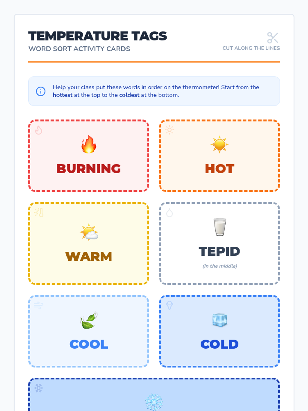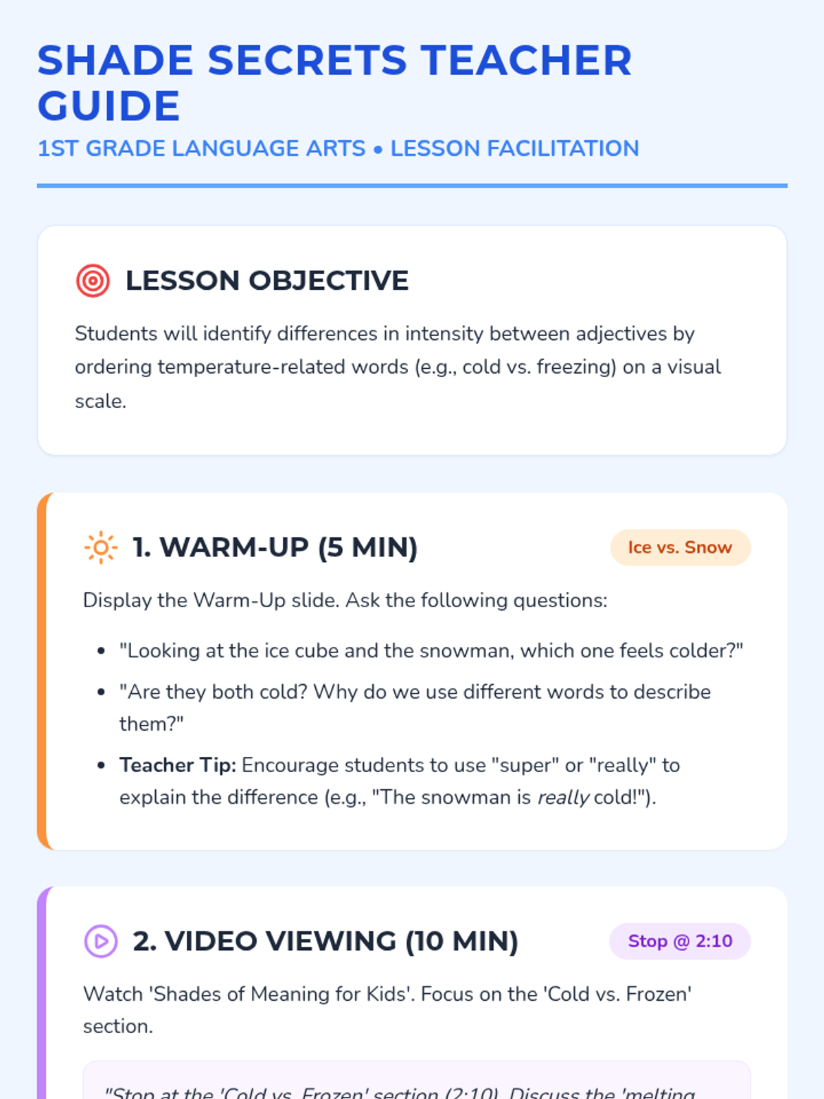 Students will explore shades of meaning by ordering temperature words from hottest to coldest. This lesson uses a video, a class discussion, and a hands-on 'Word Sort' activity to help 1st graders understand word intensity.