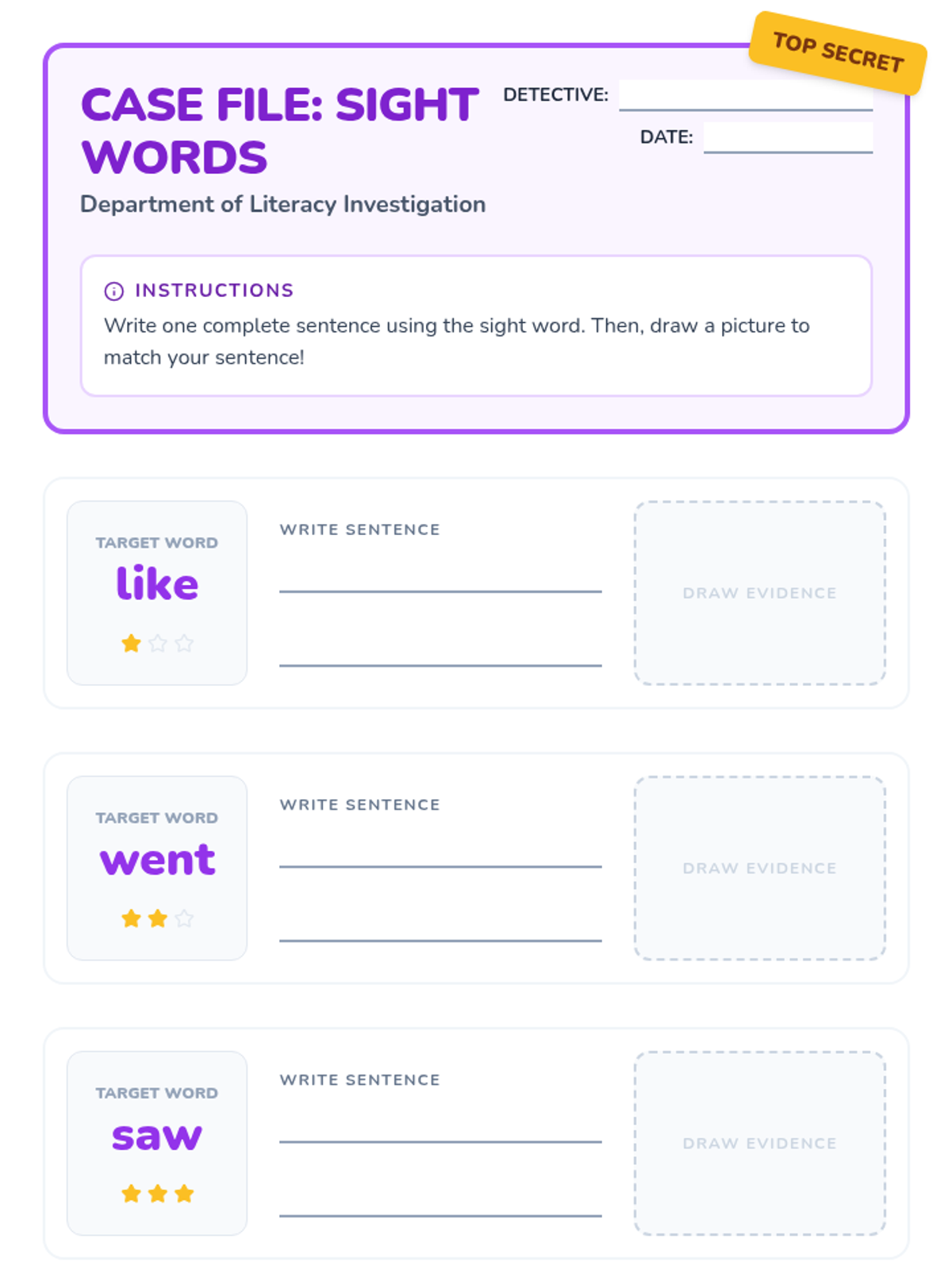 A 1st-grade lesson where students become 'Word Detectives' to identify, spell, and use sight words in sentences based on the Primer Sight Word Song.