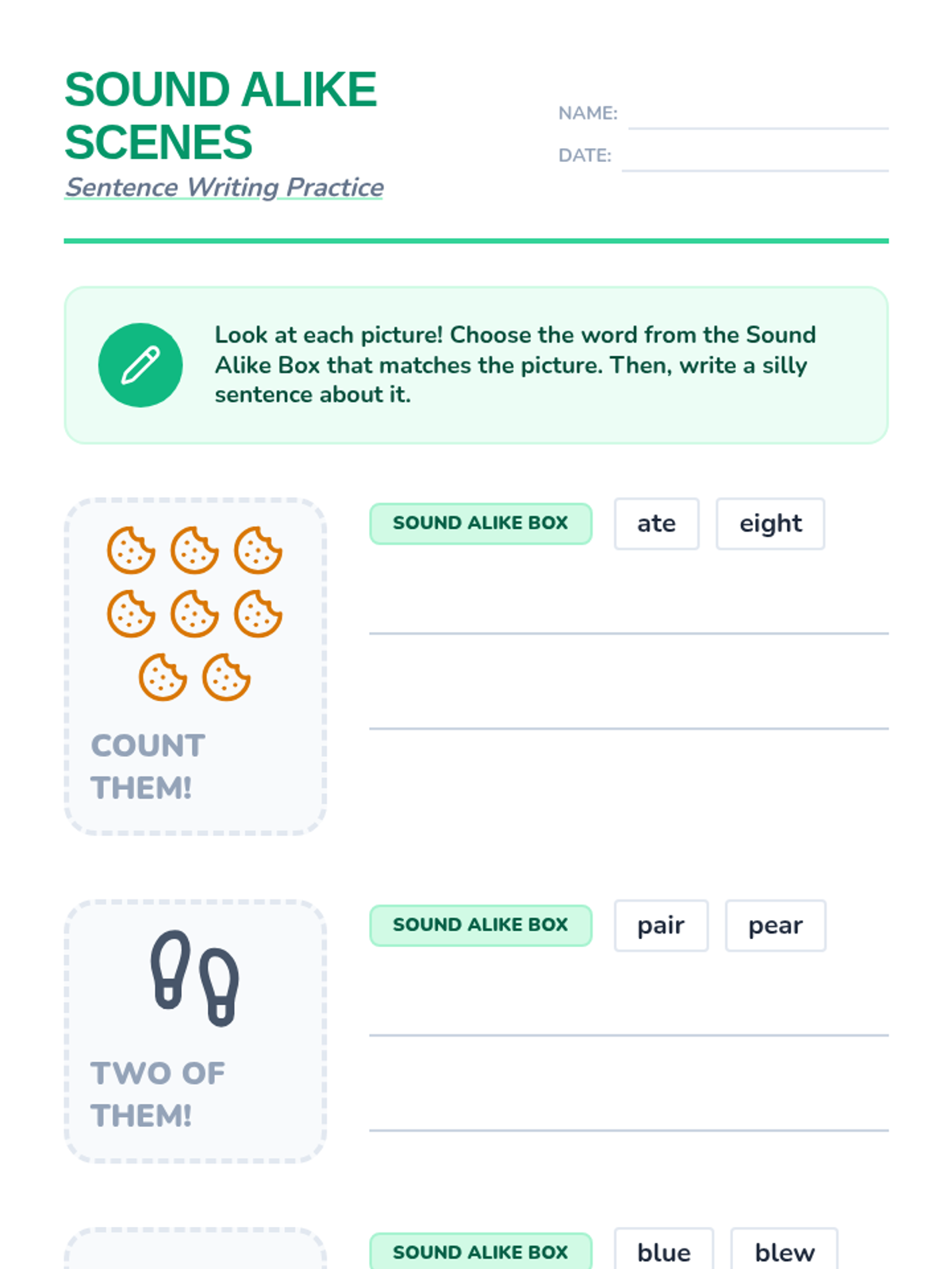 Students use picture prompts to write captions using specific homophone pairs, focusing on choosing the spelling that matches the meaning.