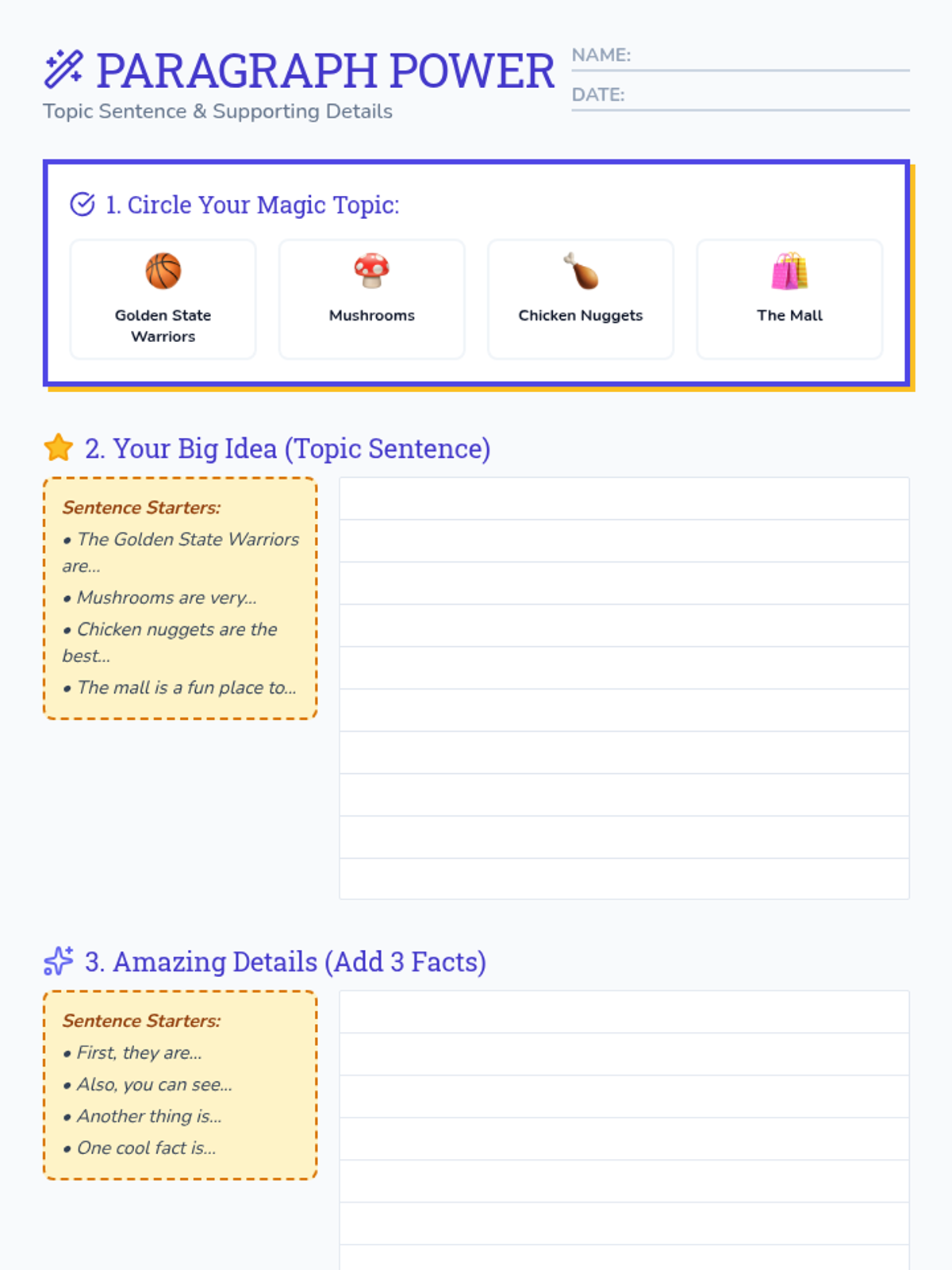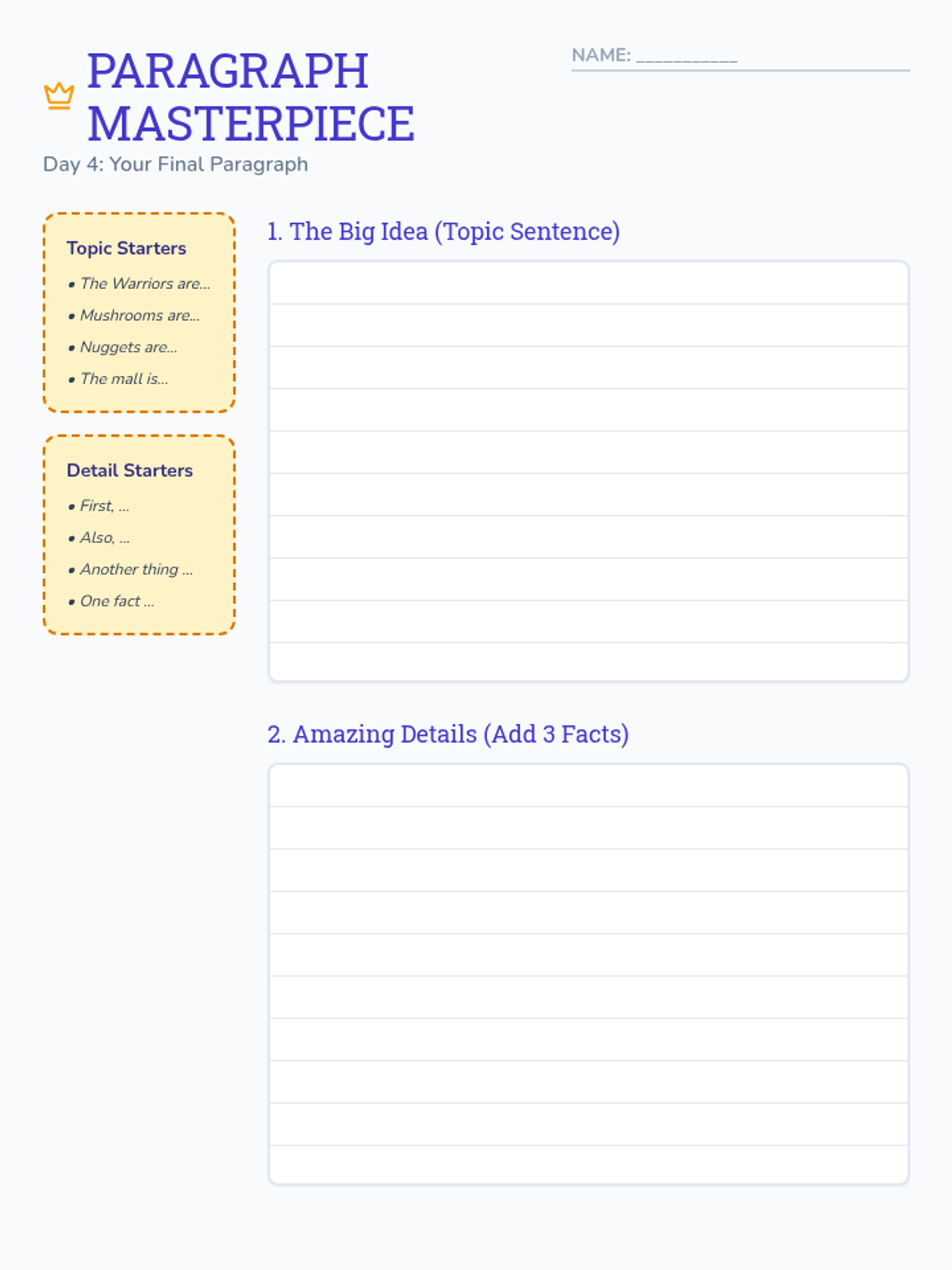 Organizing WritingLogical sequencing of ideas, paragraph construction, and the use of transition words to enhance clarity. Targets the development of strong introductions, conclusions, and cohesive narrative or argumentative structures.