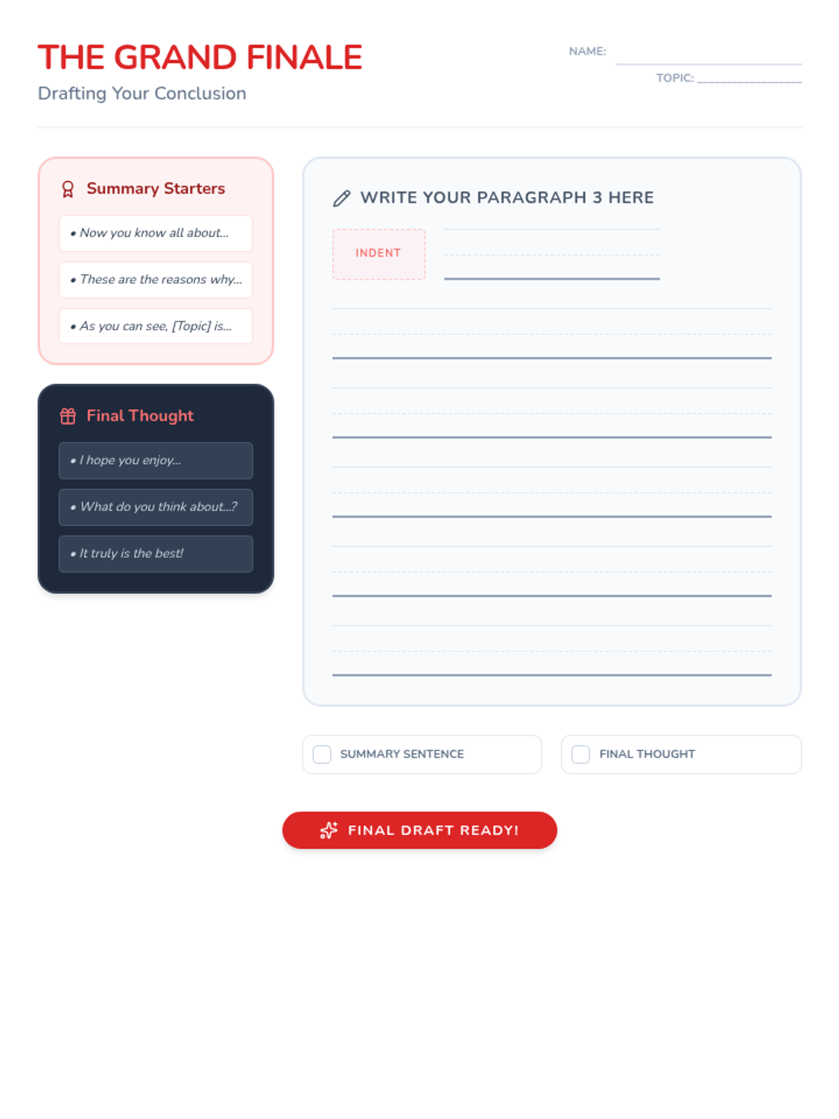 Introductions And ConclusionsHook strategies, thesis placement, and background information for effective essay openings. Guides students in synthesizing main points and providing final insights to wrap up arguments.