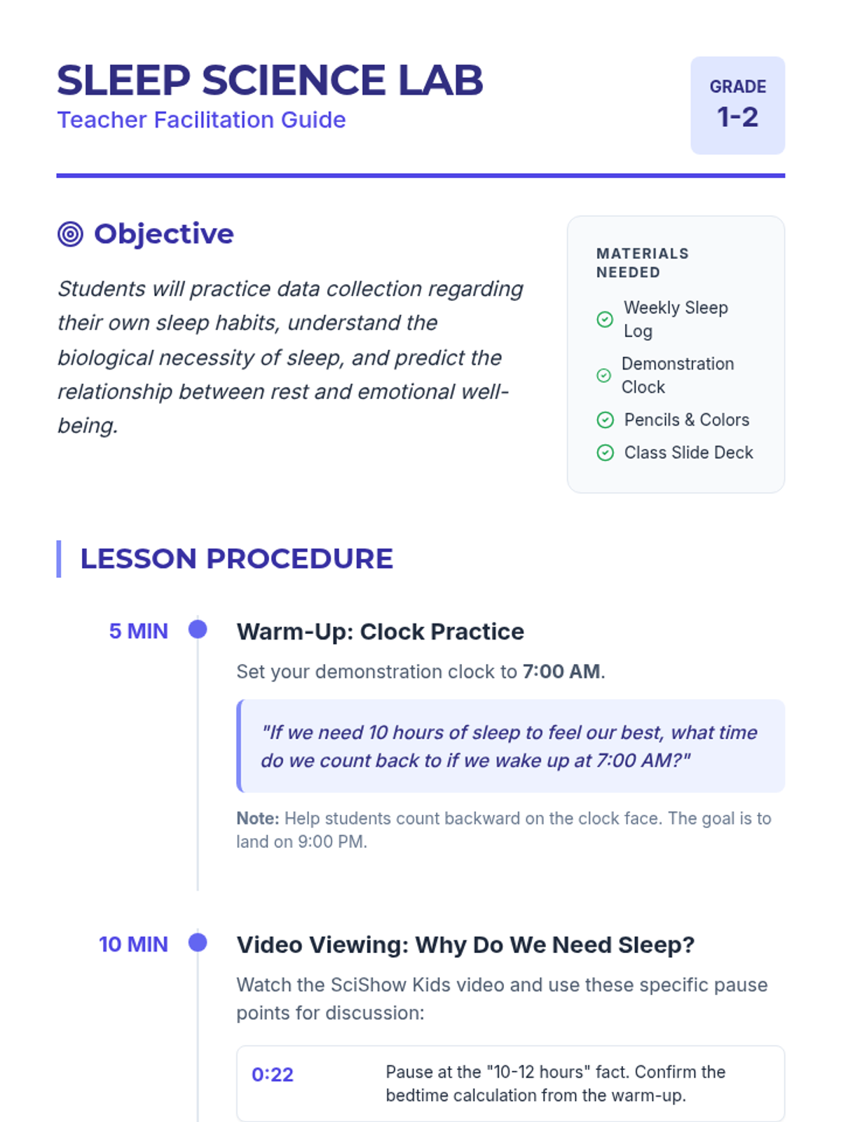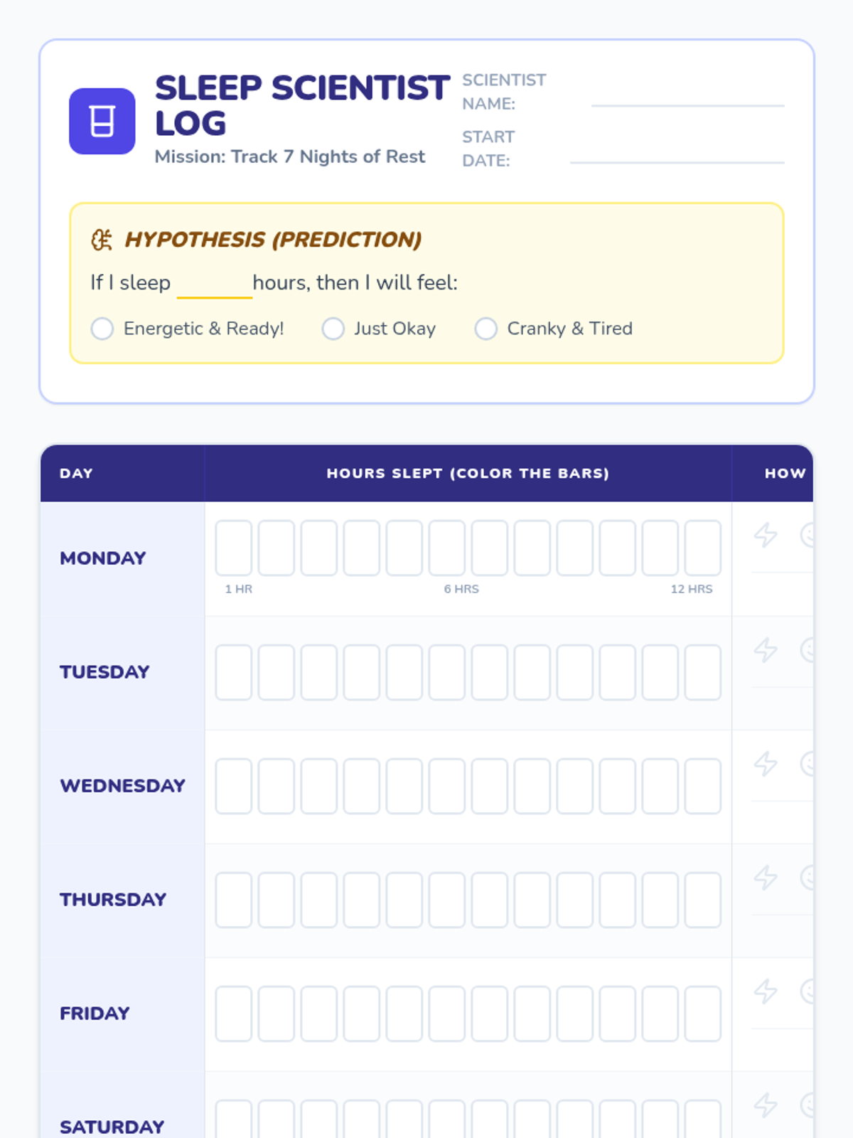 Students become 'Sleep Scientists' to track their rest, learn why sleep is essential for the body and brain, and predict how sleep affects their moods. The lesson includes a presentation with a video, a 7-day tracking log, and a teaching guide.