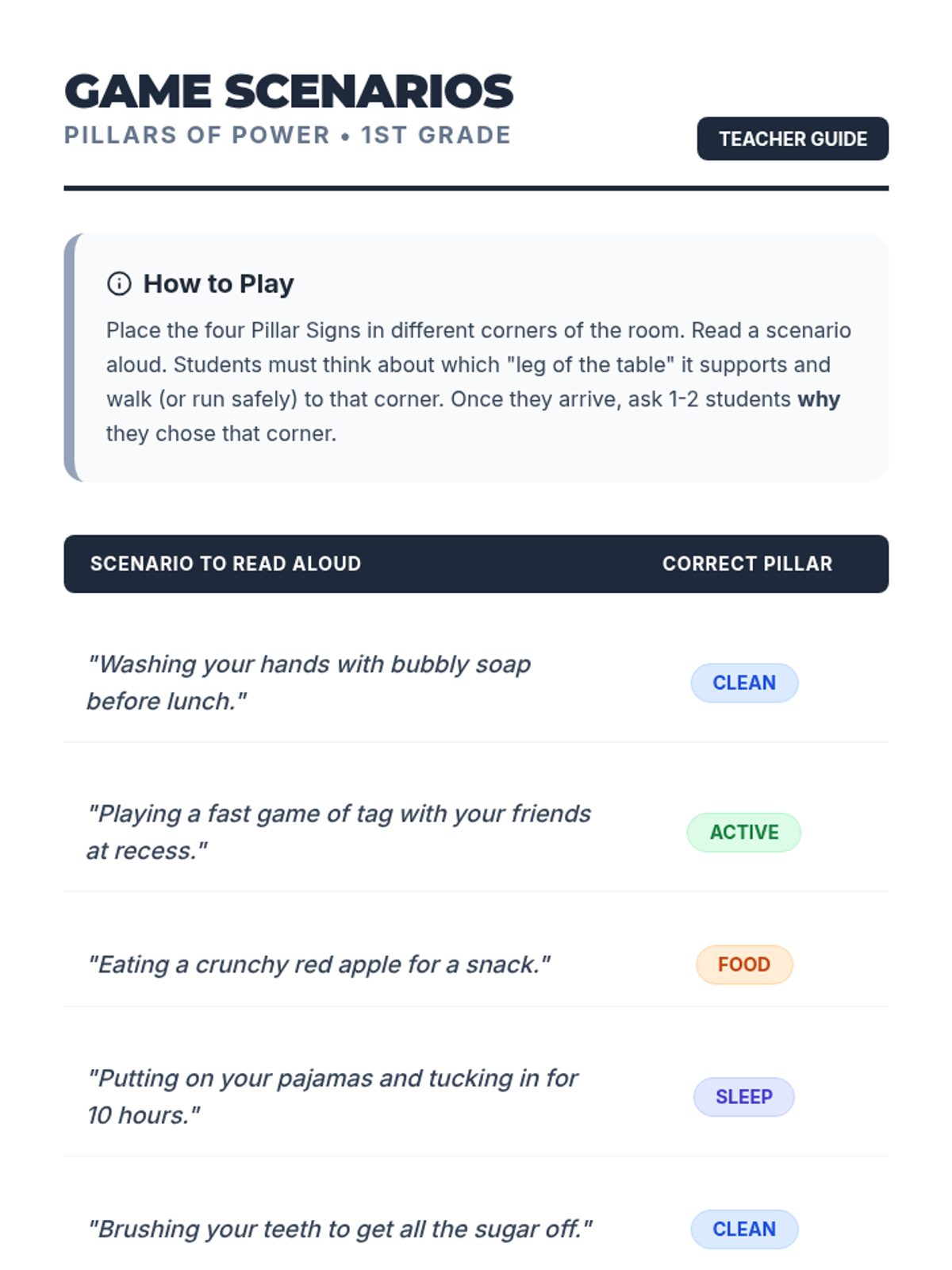 A 1st Grade lesson introducing the four pillars of health (Hygiene, Activity, Nutrition, and Sleep) through a visual metaphor, an educational video, and an active movement game.