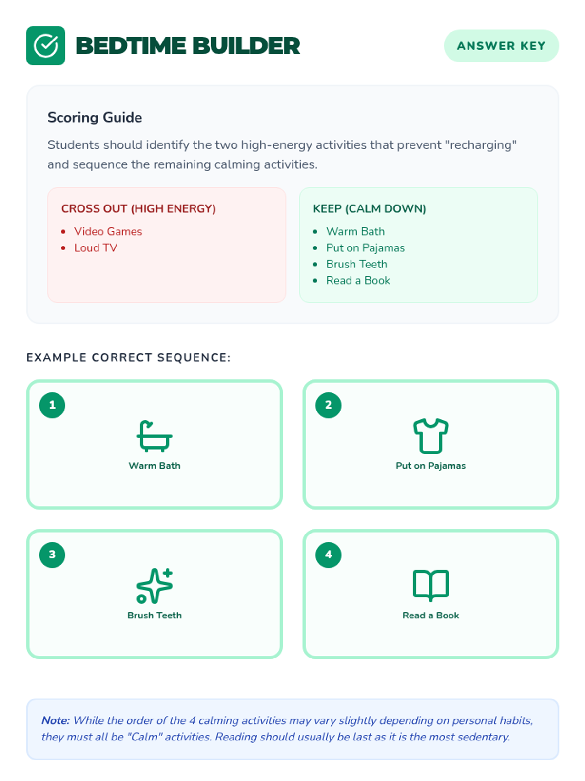 A lesson for K-1 students to identify and sequence healthy bedtime habits using a catchy video and hands-on sorting activity.