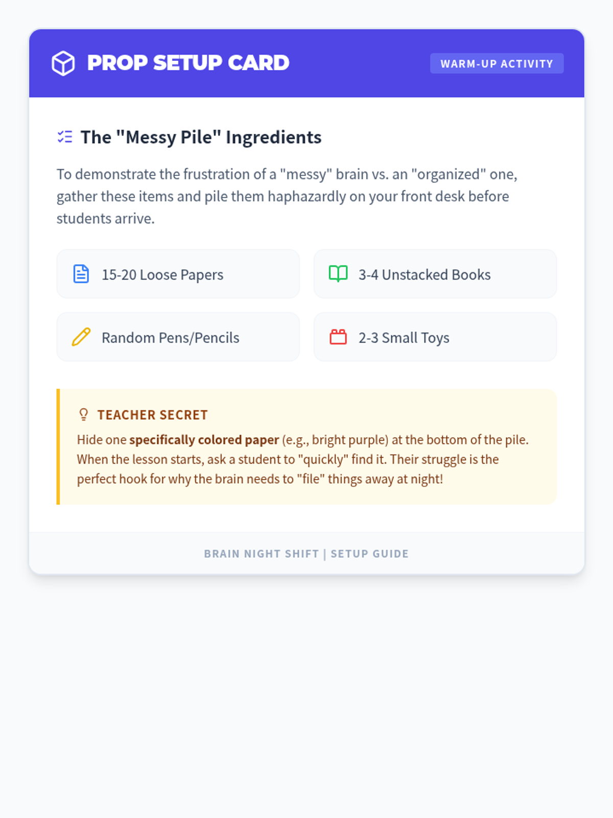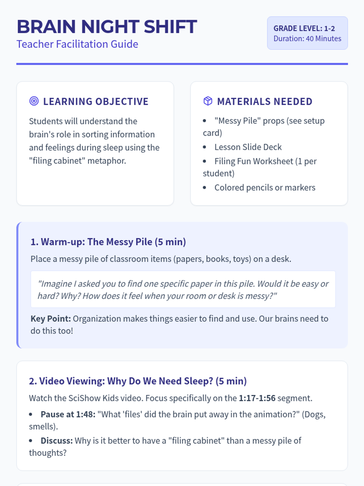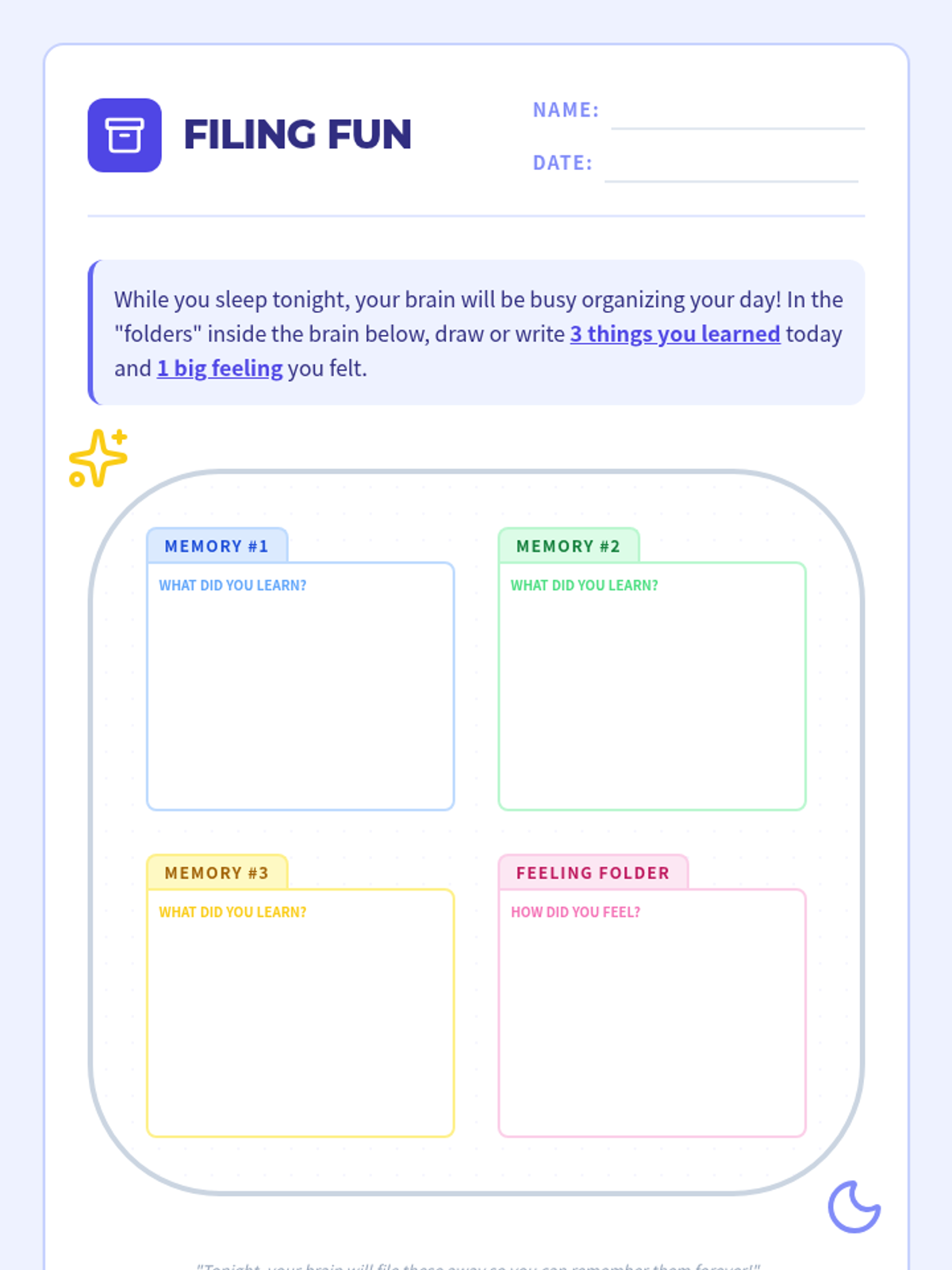 A lesson for 1st-2nd graders about how the brain organizes memories and feelings like a filing cabinet during sleep. Includes a hands-on 'messy vs. organized' activity, a video analysis, and a creative worksheet to map out 'night shift' filing.