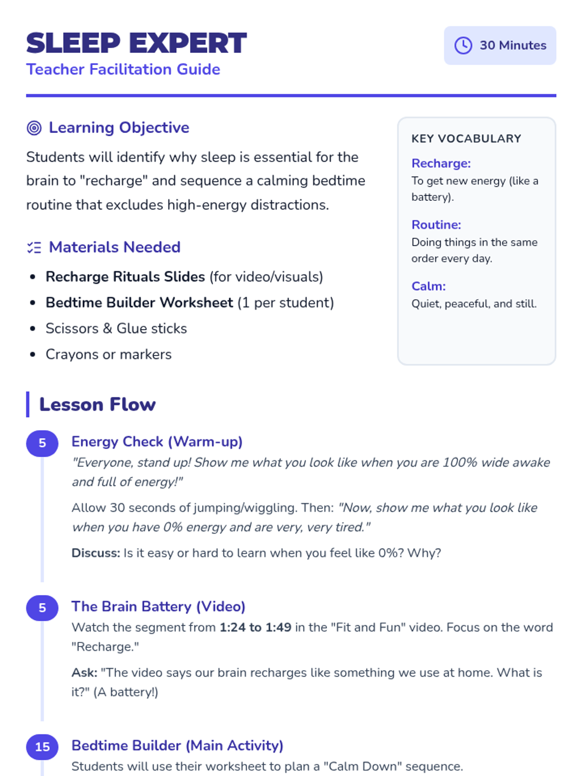 A 1st-2nd grade lesson focused on the biological necessity of sleep and the creation of effective, calming bedtime routines to help the brain 'recharge'.
