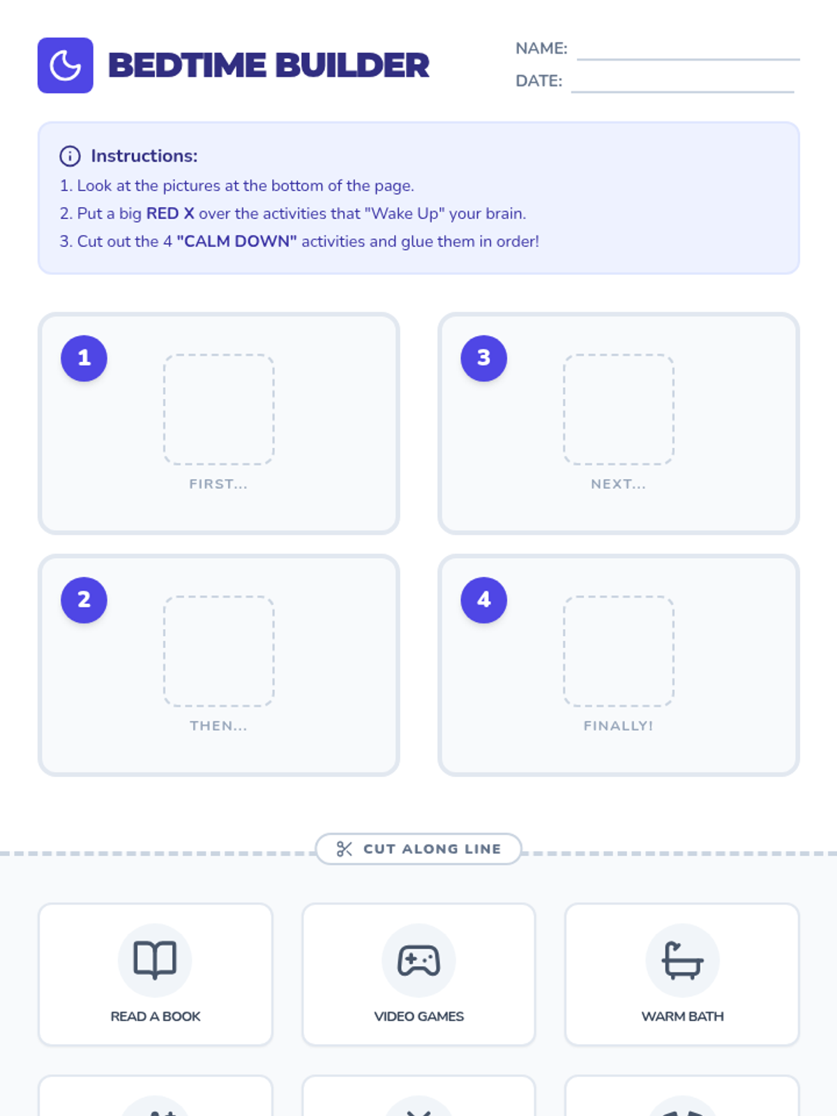A lesson for Kindergarten and 1st-grade students to learn about the importance of sleep and create their own bedtime routines using a fun 'Bedtime Train' craft.
