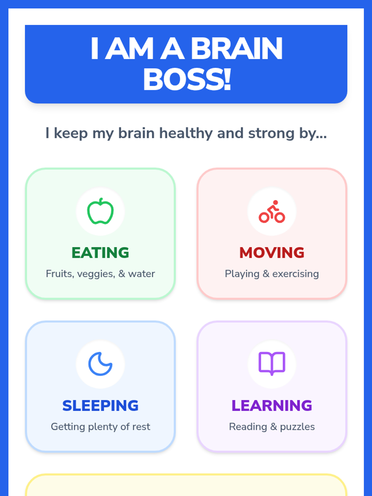 A series of interactive materials teaching elementary students about how their brain works, how to keep it healthy through nutrition and sleep, and how to protect it during physical activities.