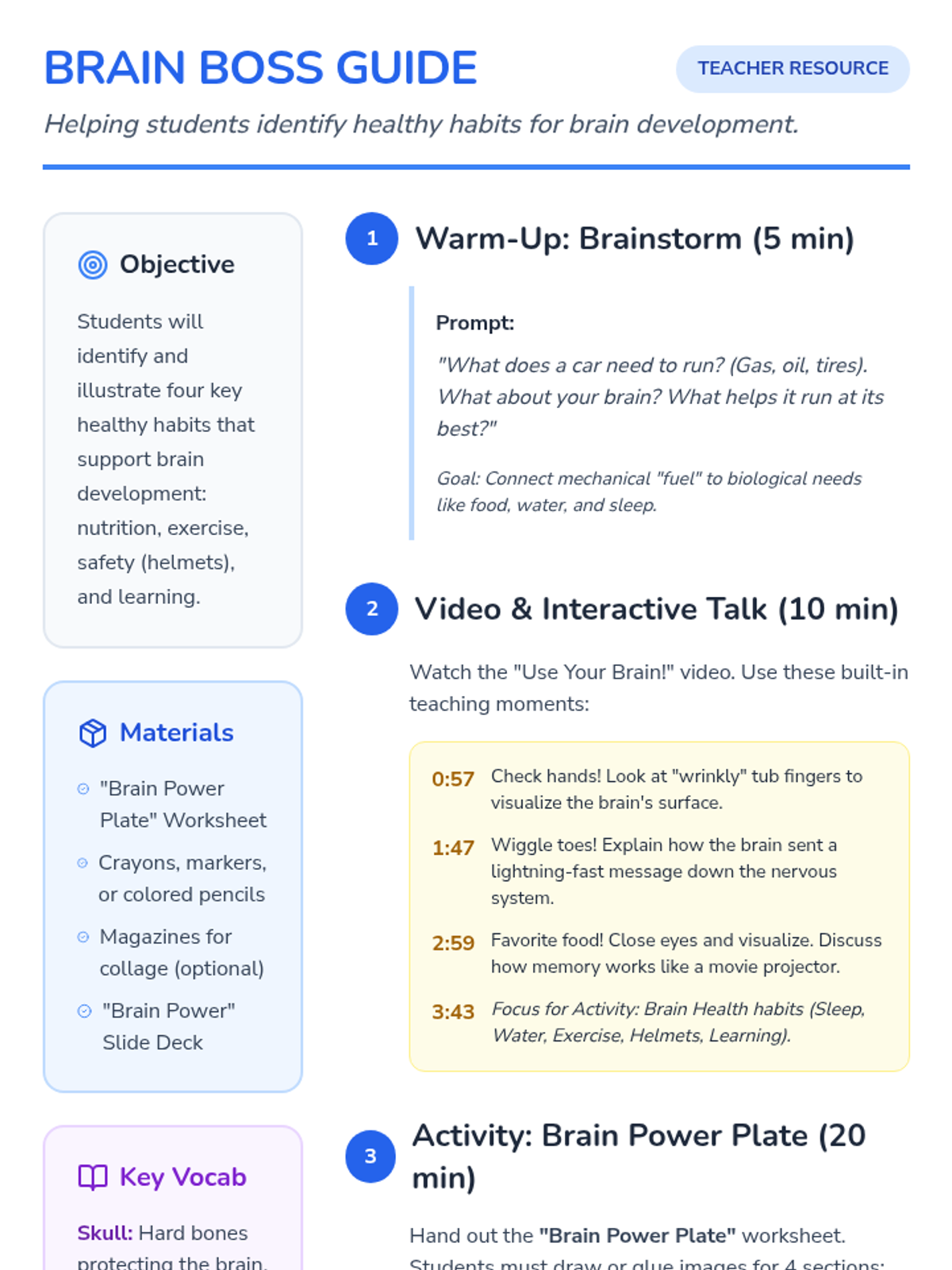 A foundational lesson on physical health focusing on hygiene, nutrition, and sleep. Students learn to view themselves as 'Body Heroes' who protect and fuel their systems through daily habits.