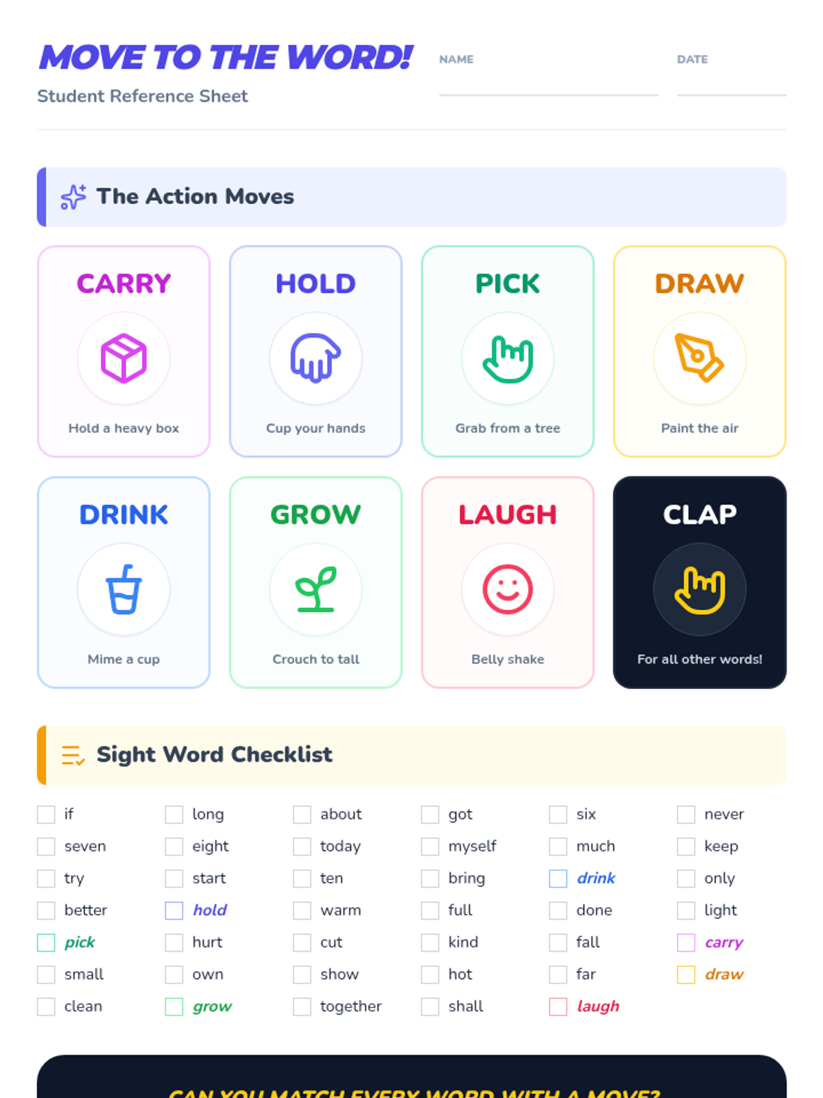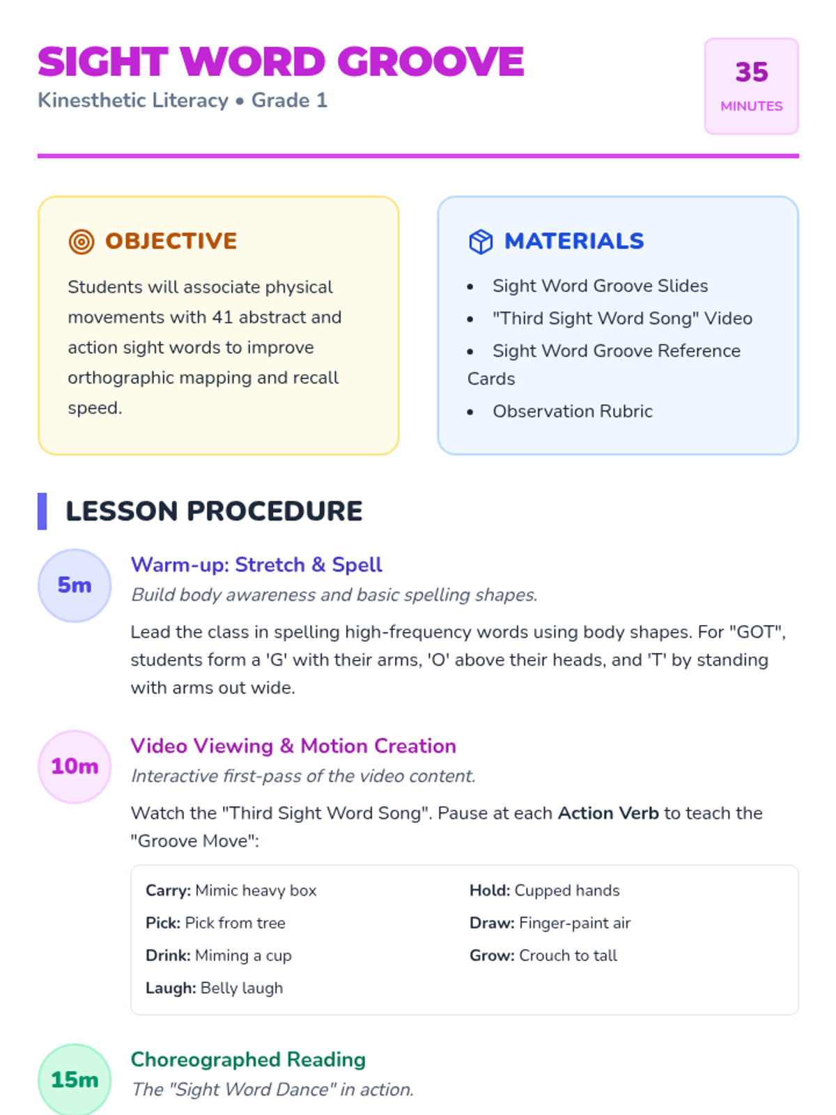 A kinesthetic literacy lesson for 1st graders that uses movement and sign-language-inspired gestures to build sight word recognition and memory through the "Third Sight Word Song."