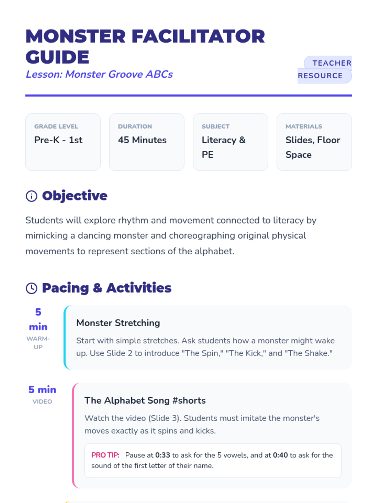 A high-energy lesson for Pre-K to 1st Grade that combines rhythm, dance, and letter recognition. Students mimic a dancing monster's moves and then choreograph their own physical movements for sections of the alphabet.