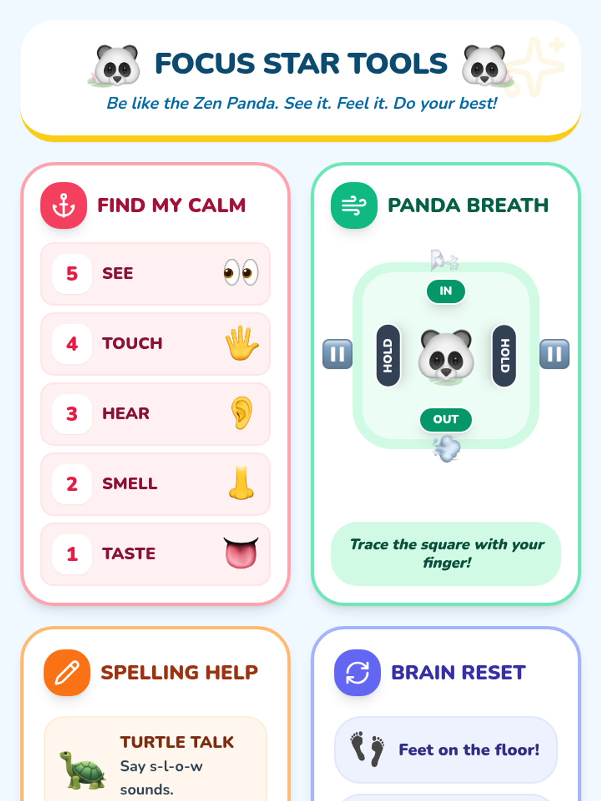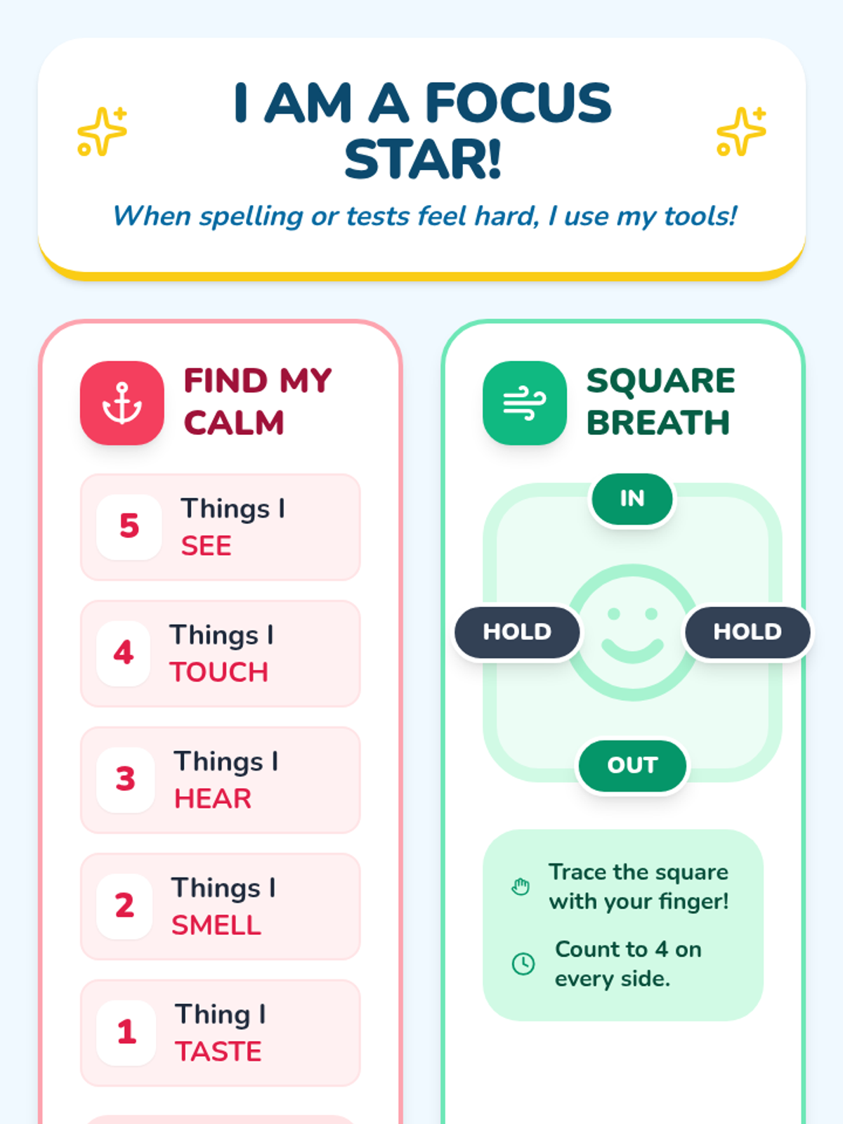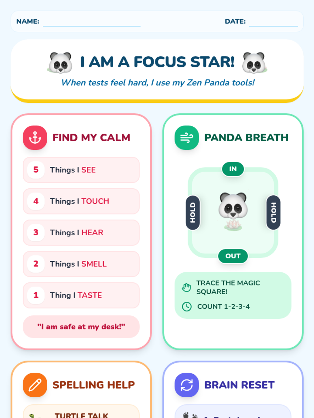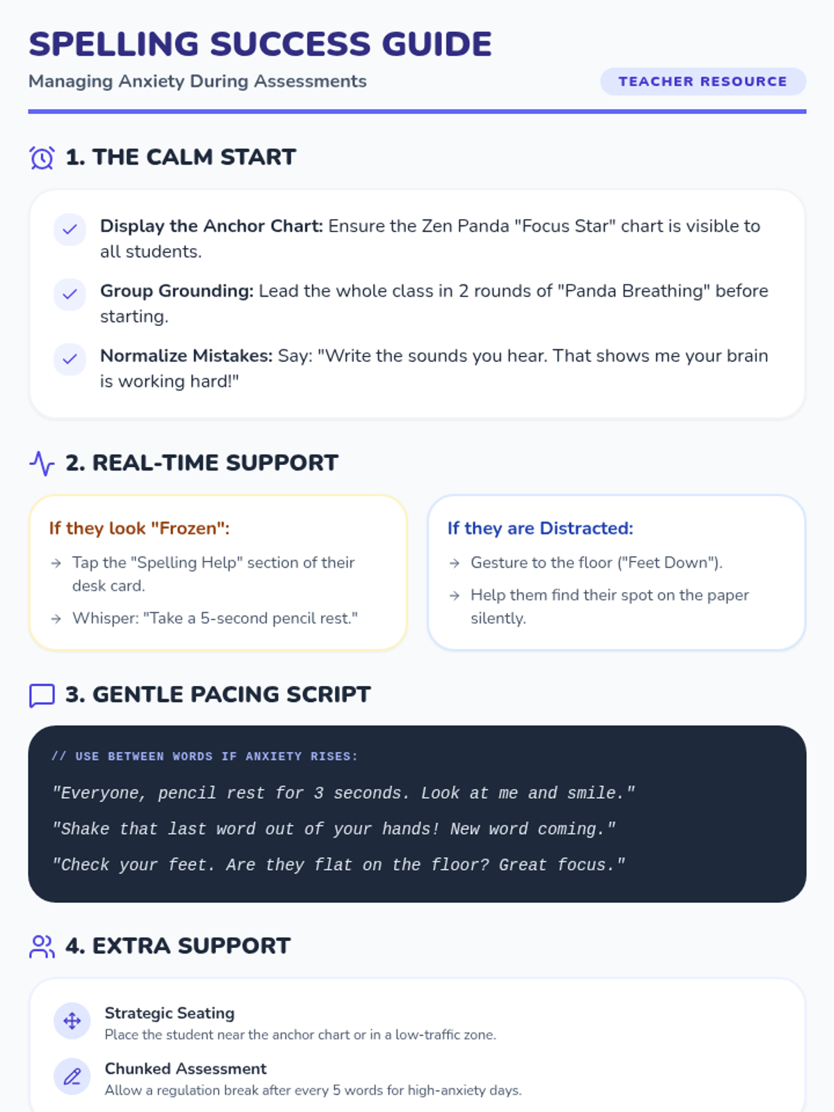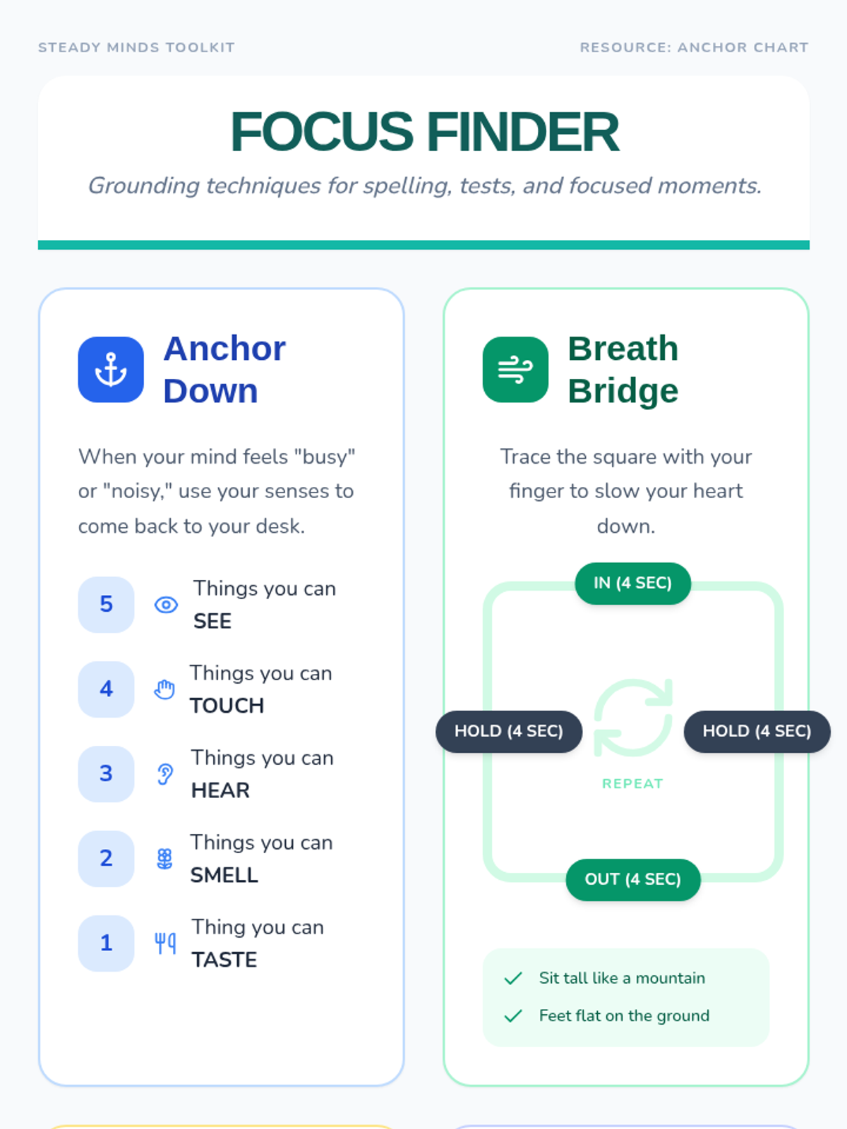 A set of resources designed to help students manage anxiety and stay focused during spelling tests and assessments using grounding and self-regulation techniques.
